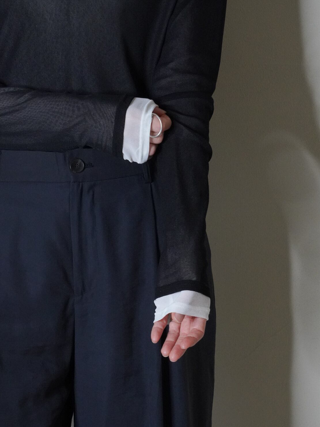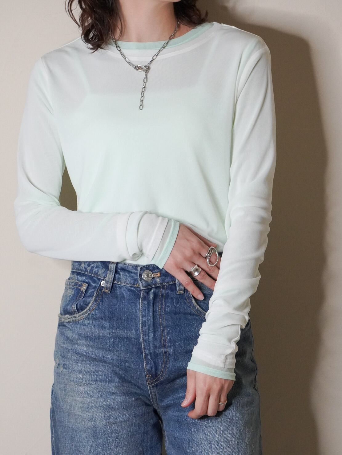 重ねることで自然なボリューム感がプラスされ透け感を抑えながら、襟ぐりやお袖から違うお色をチラ見セすることで、こなれた雰囲気がお楽しみいただけます