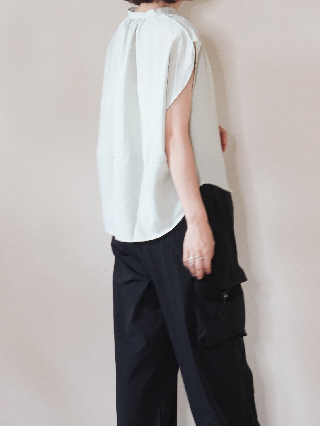 すっきりとしたバンドカラーで上品な印象のブラウス