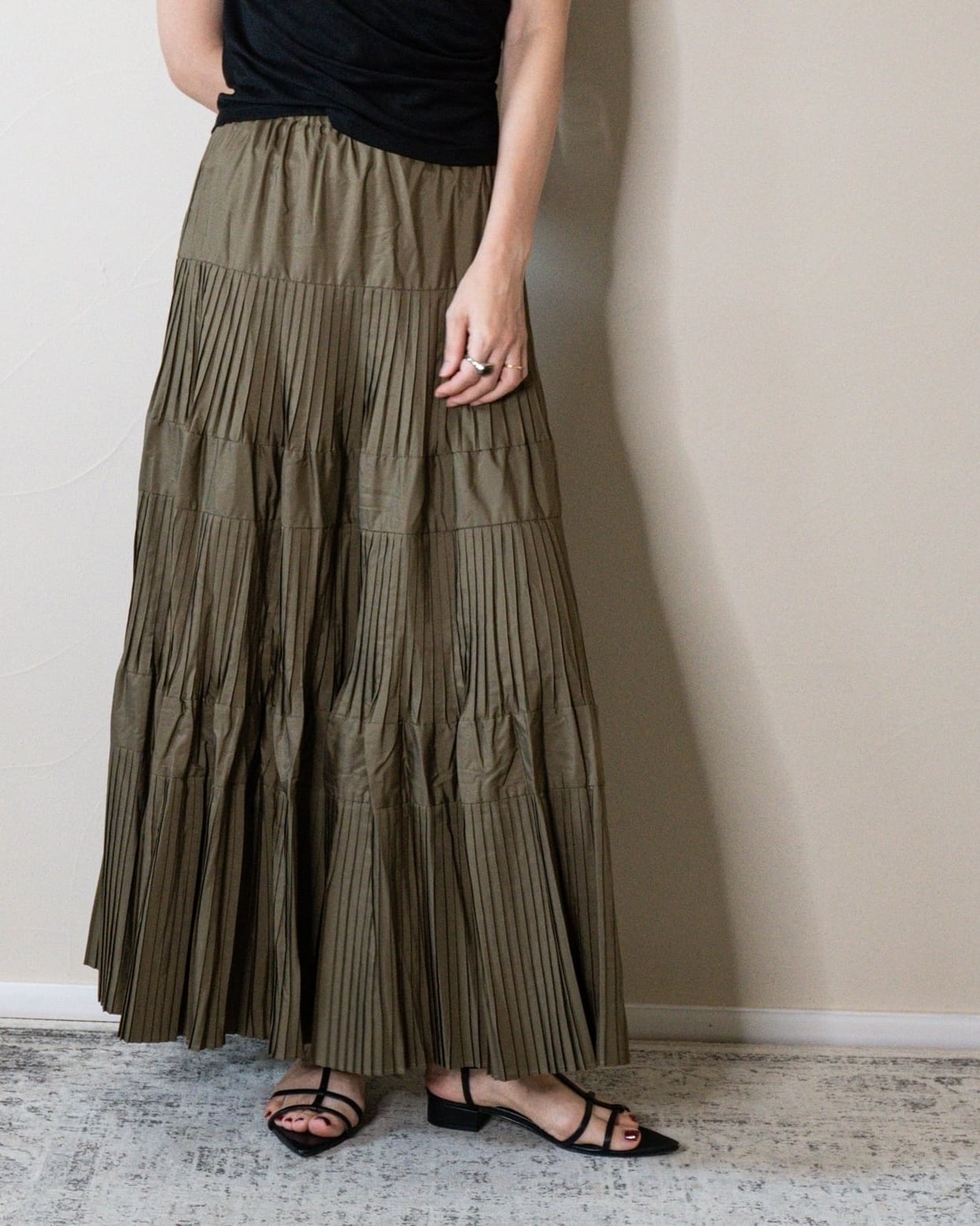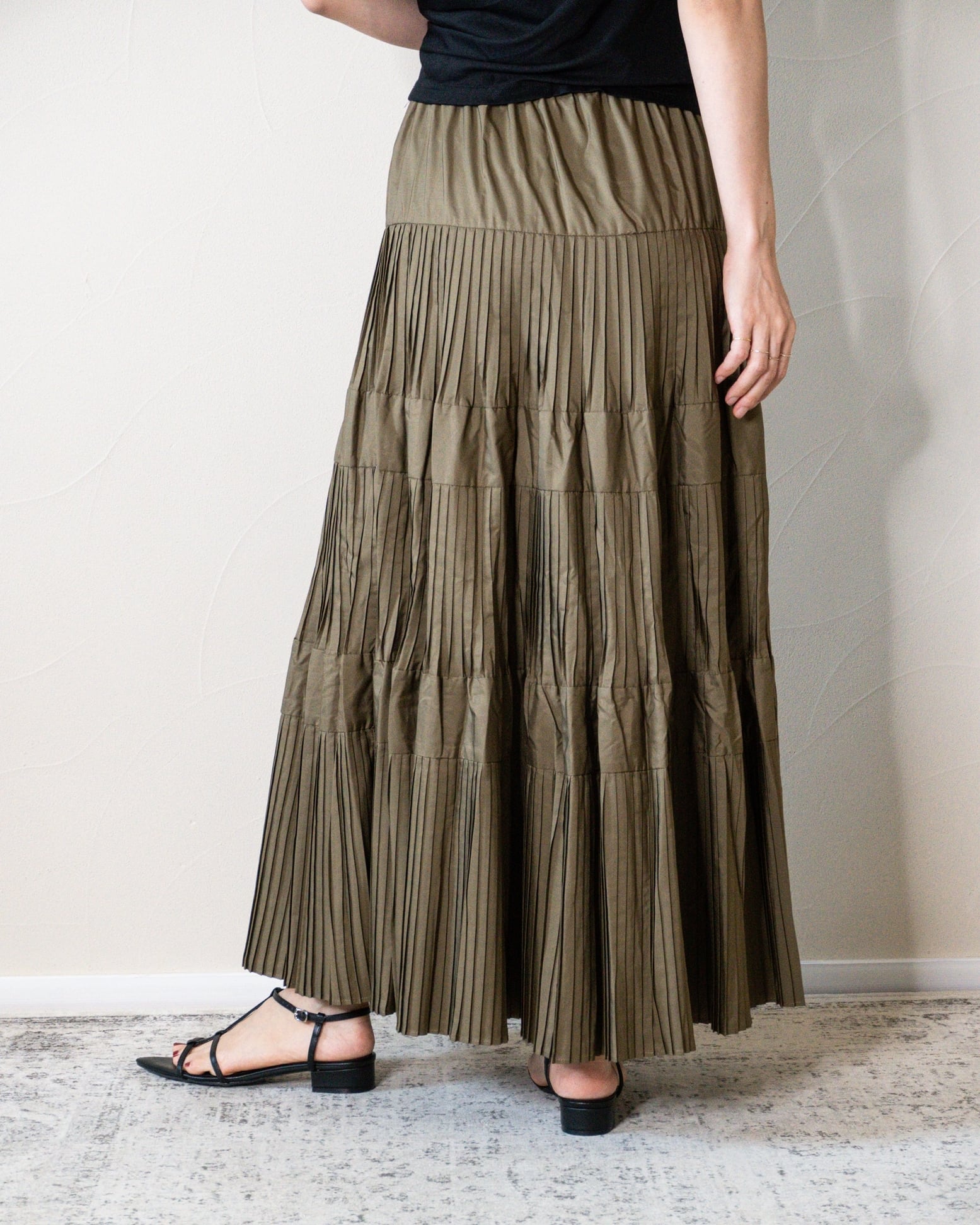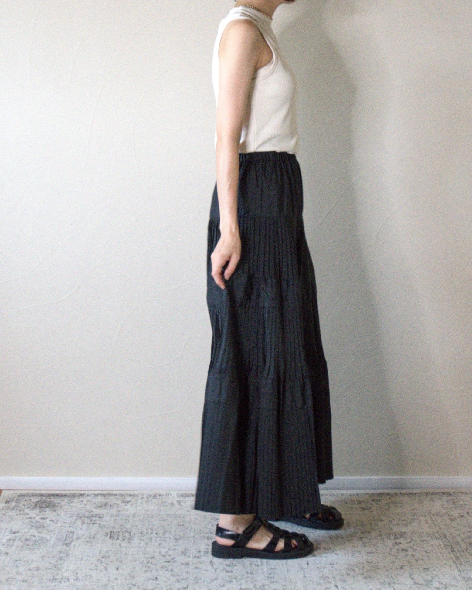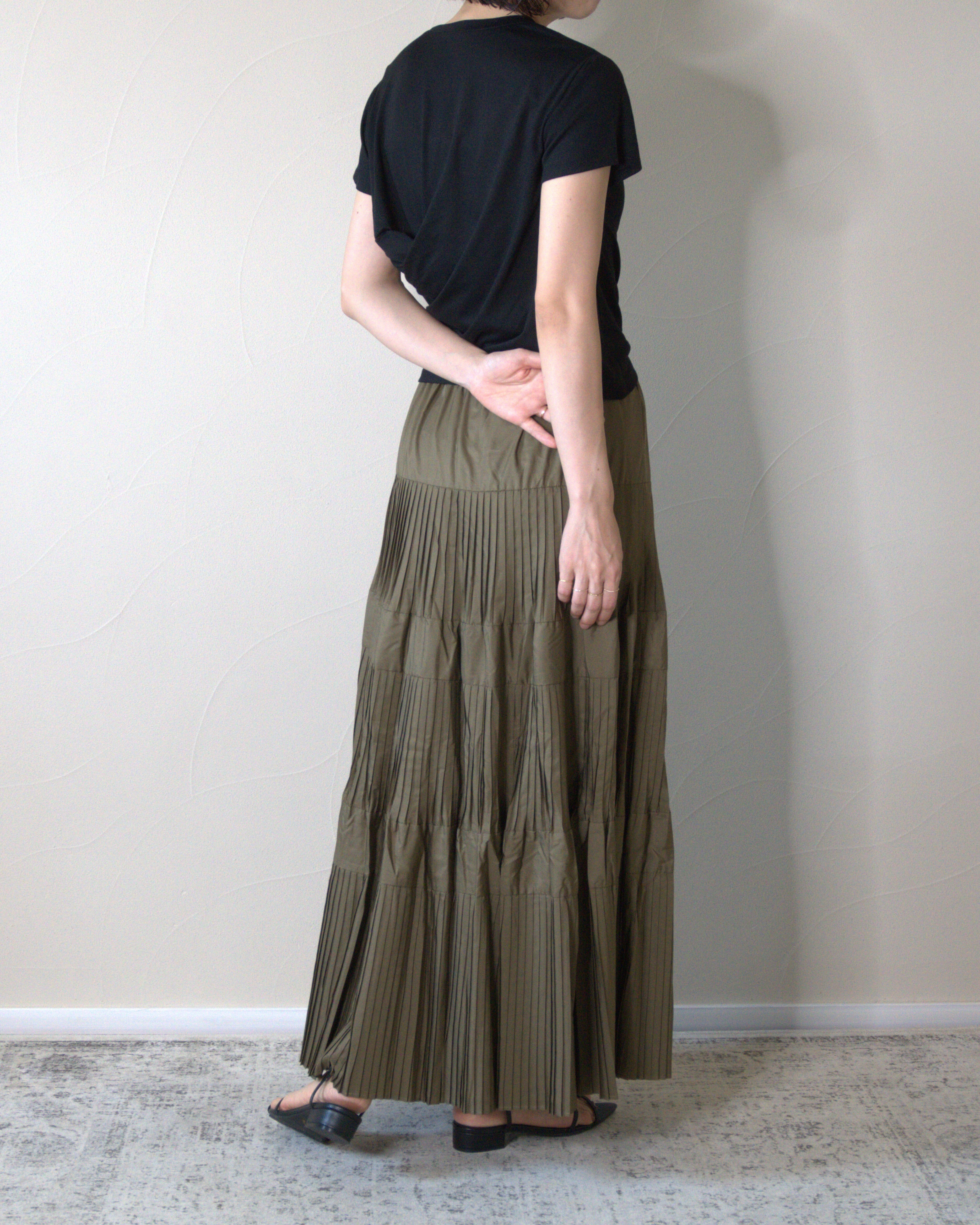 光沢とハリのある軽やかな素材感と動きのあるシルエットが魅力のプリーツティアードスカート。