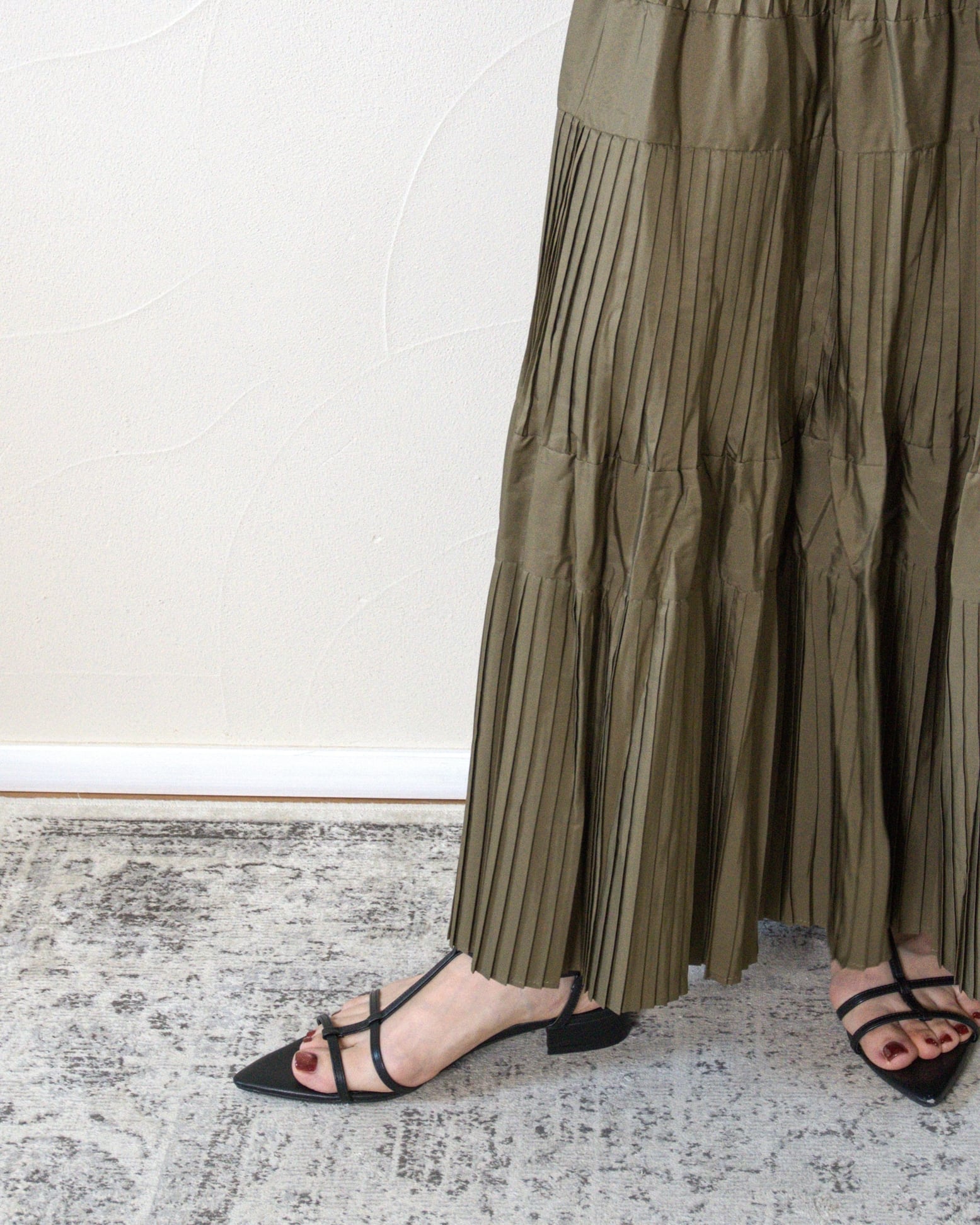 プリーツをいれた華やかな印象で、カジュアルにTシャツを合わせた普段のお出かけやお買い物から、上品なお食事シーンなどにもぴったりなアイテムです
