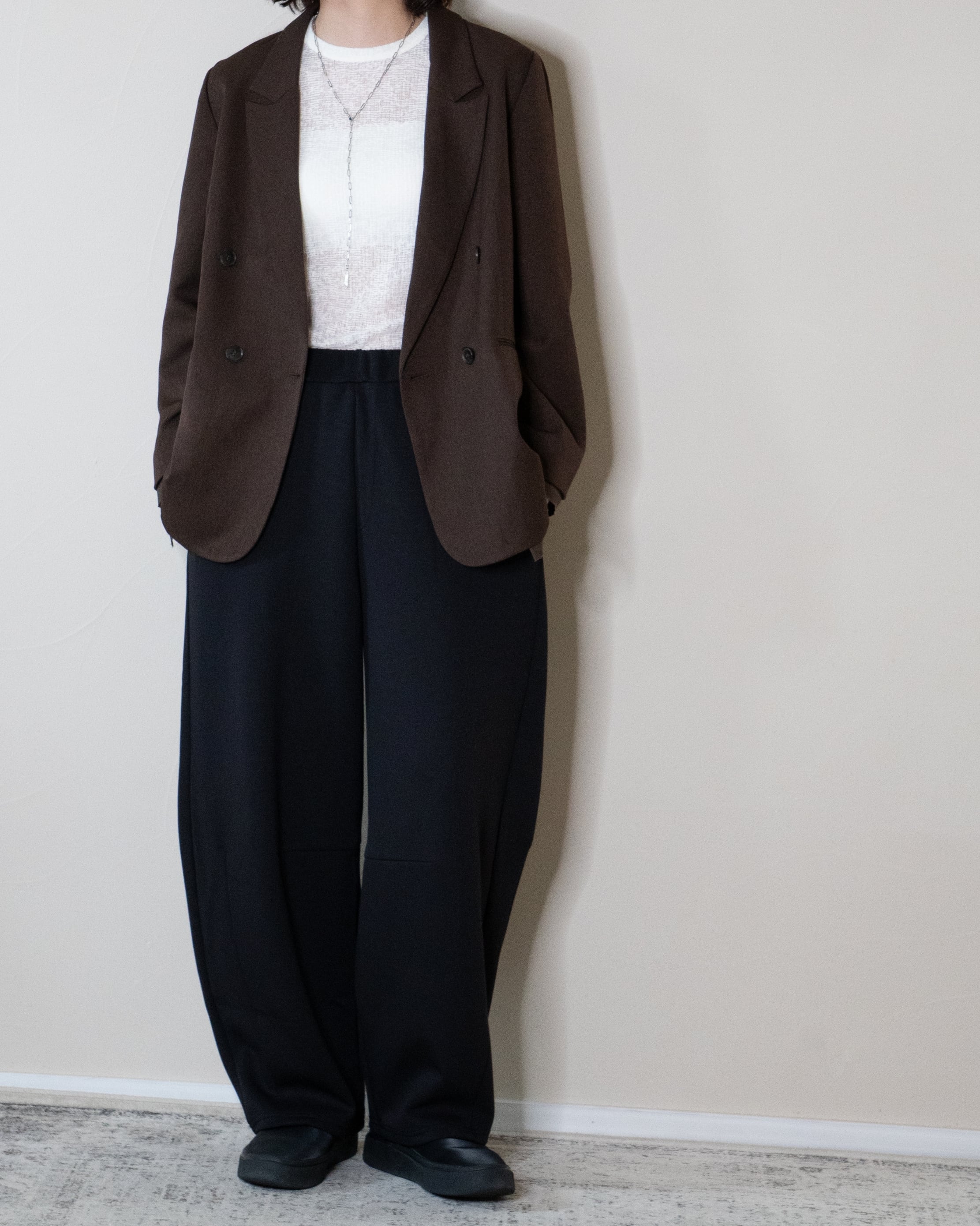2枚の生地を貼り合わせる製法のボンディング素材は、適度な厚みとハリがあり、シルエットをきれいに保ちながらも軽やかなはき心地が魅力です