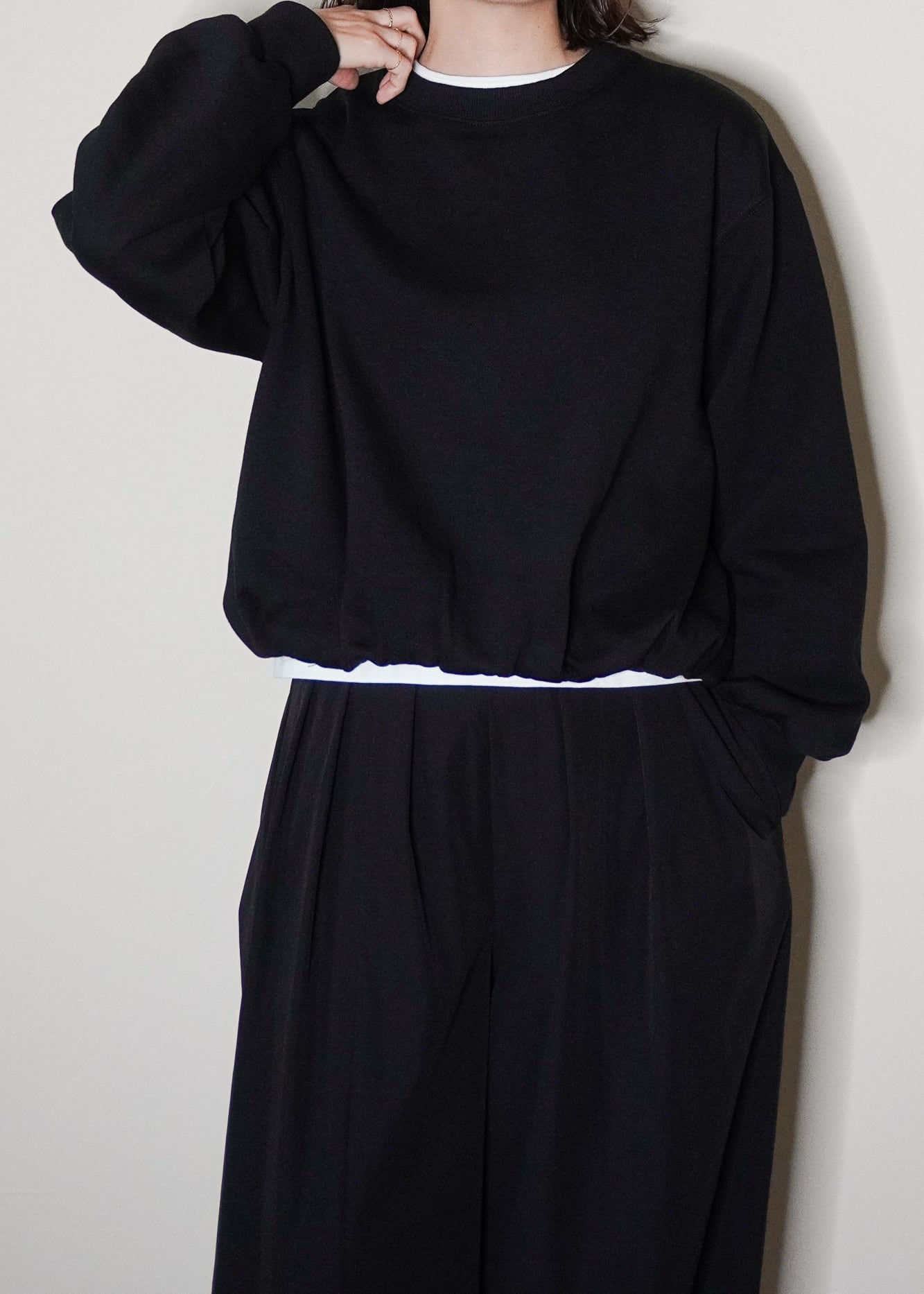 ウエストで軽く止まるので、インしなくてもバランスよく決まるデザインがカジュアルになり過ぎない大人のスエットスタイルを演出してくれます