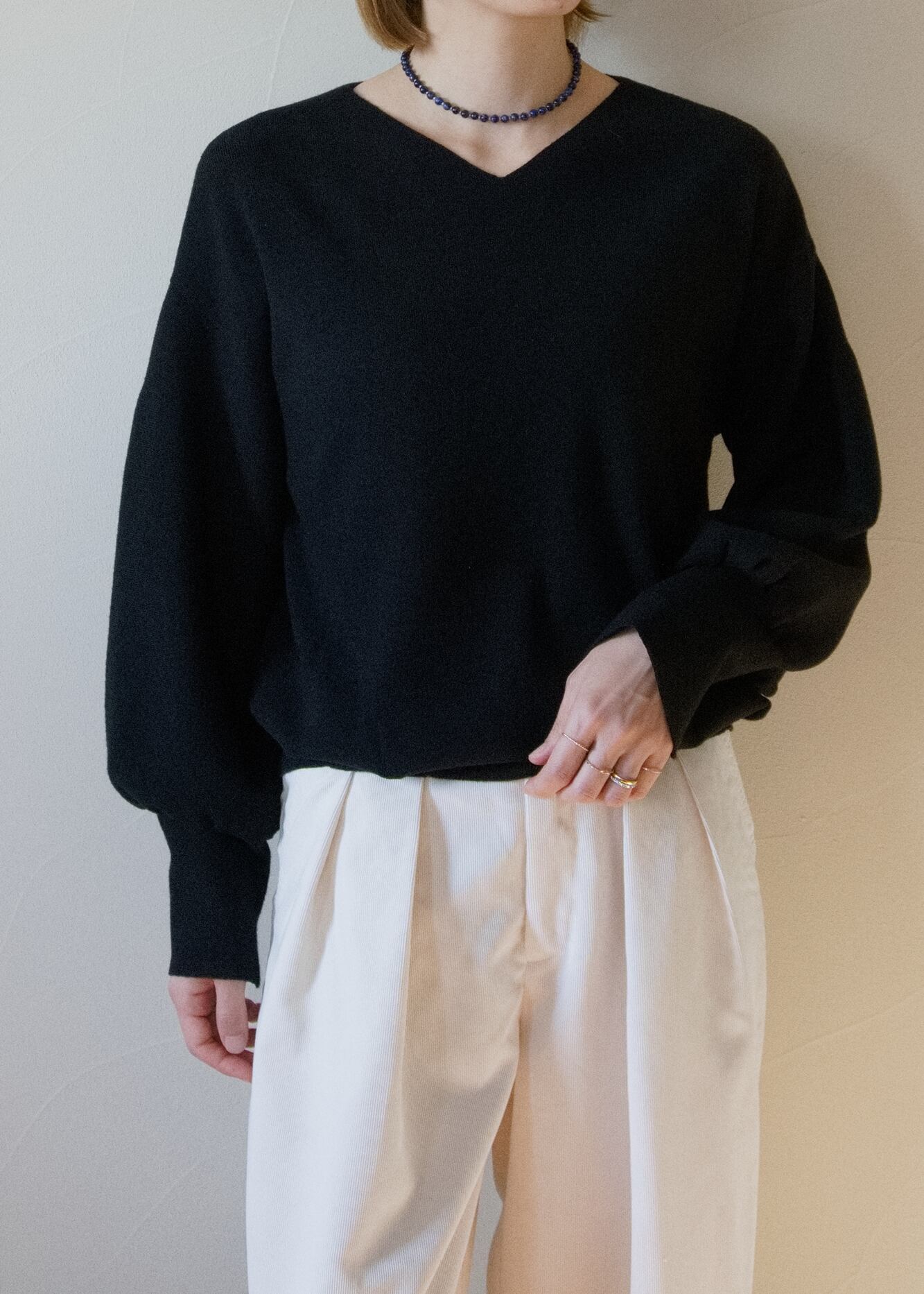 上品な浅めのVネックの大人の華奢見えが叶うのが嬉しいアイテムです