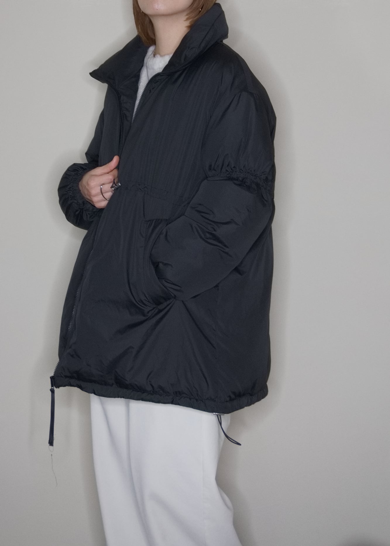 また二の腕部分にシャーリングを入れて絞ることで、着膨れしないスッキリとした雰囲気に仕上げています