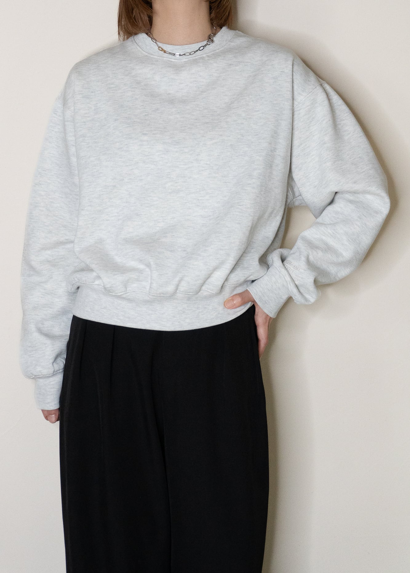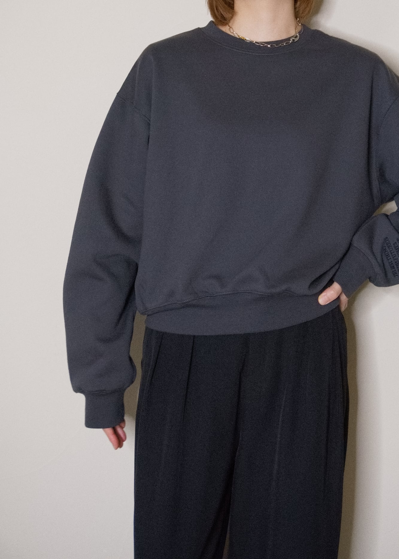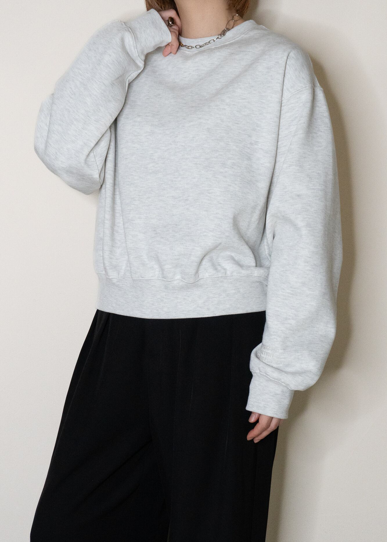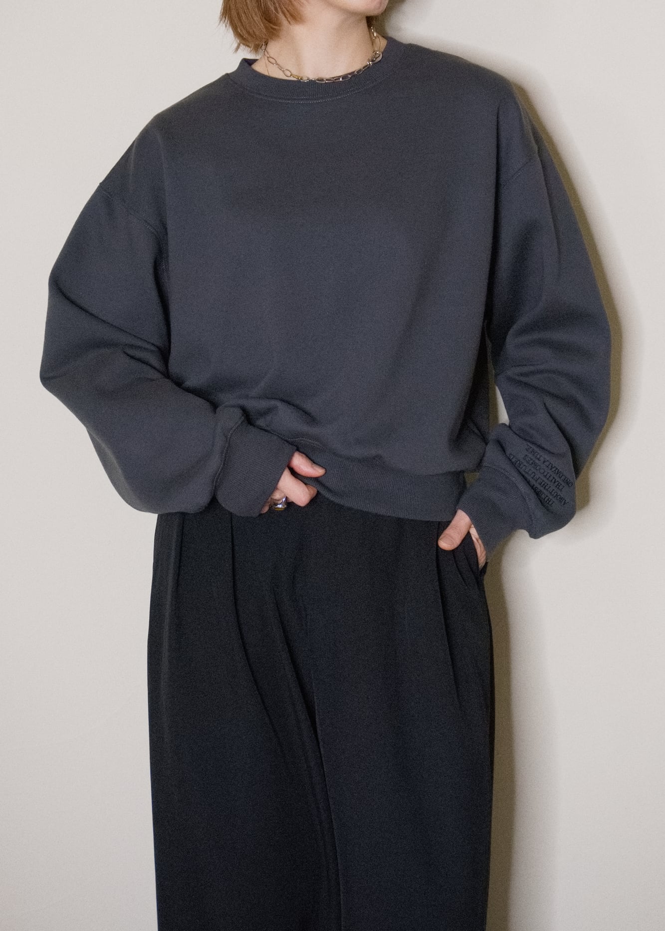 長めのクシュっとする袖と、自然にウエストで止まるすっきりとした着丈のバランスで、ゆったりなのに、ルーズにならないのが大人スエットのポイント