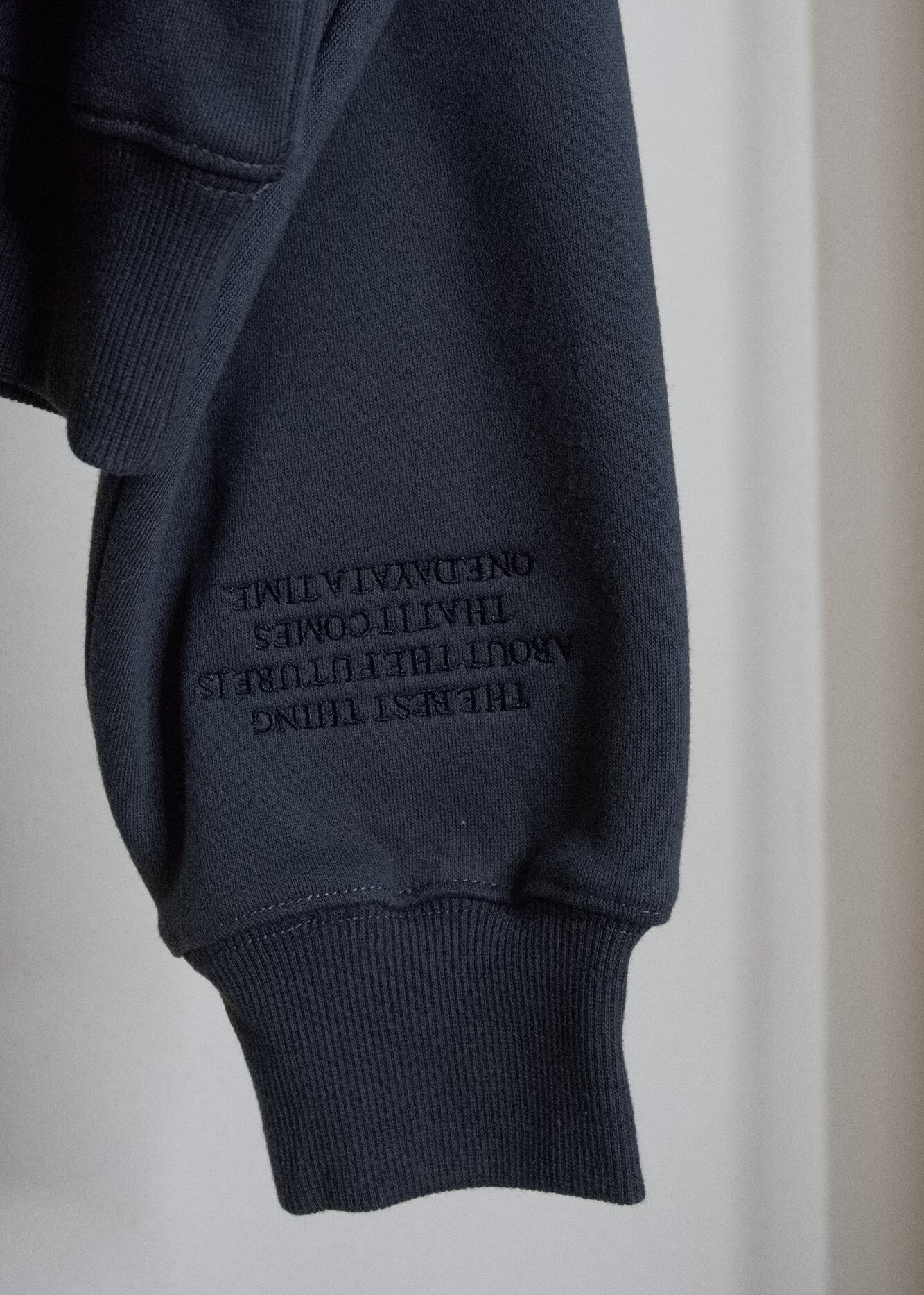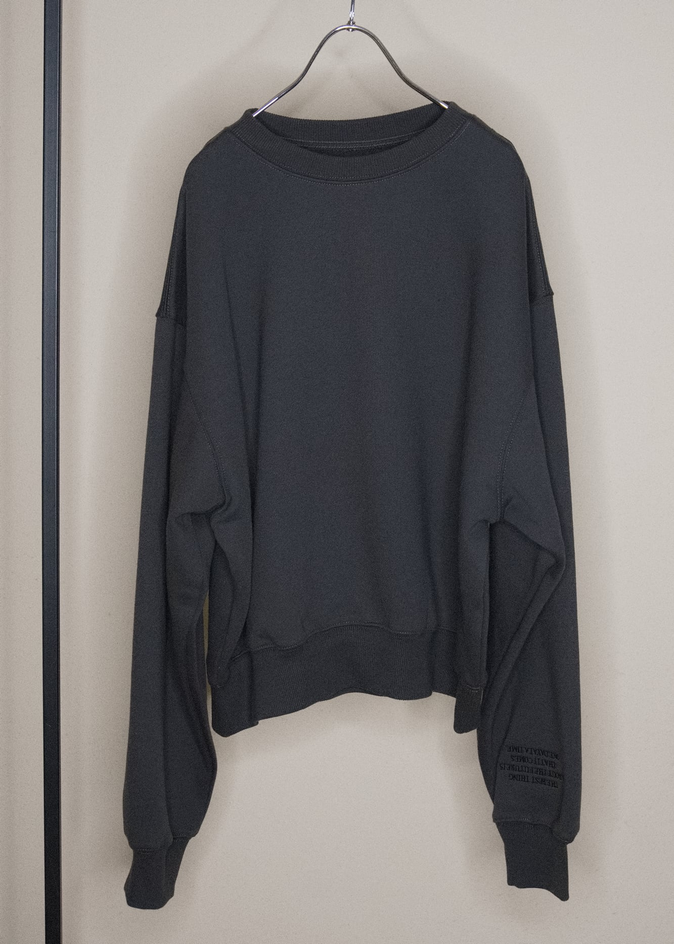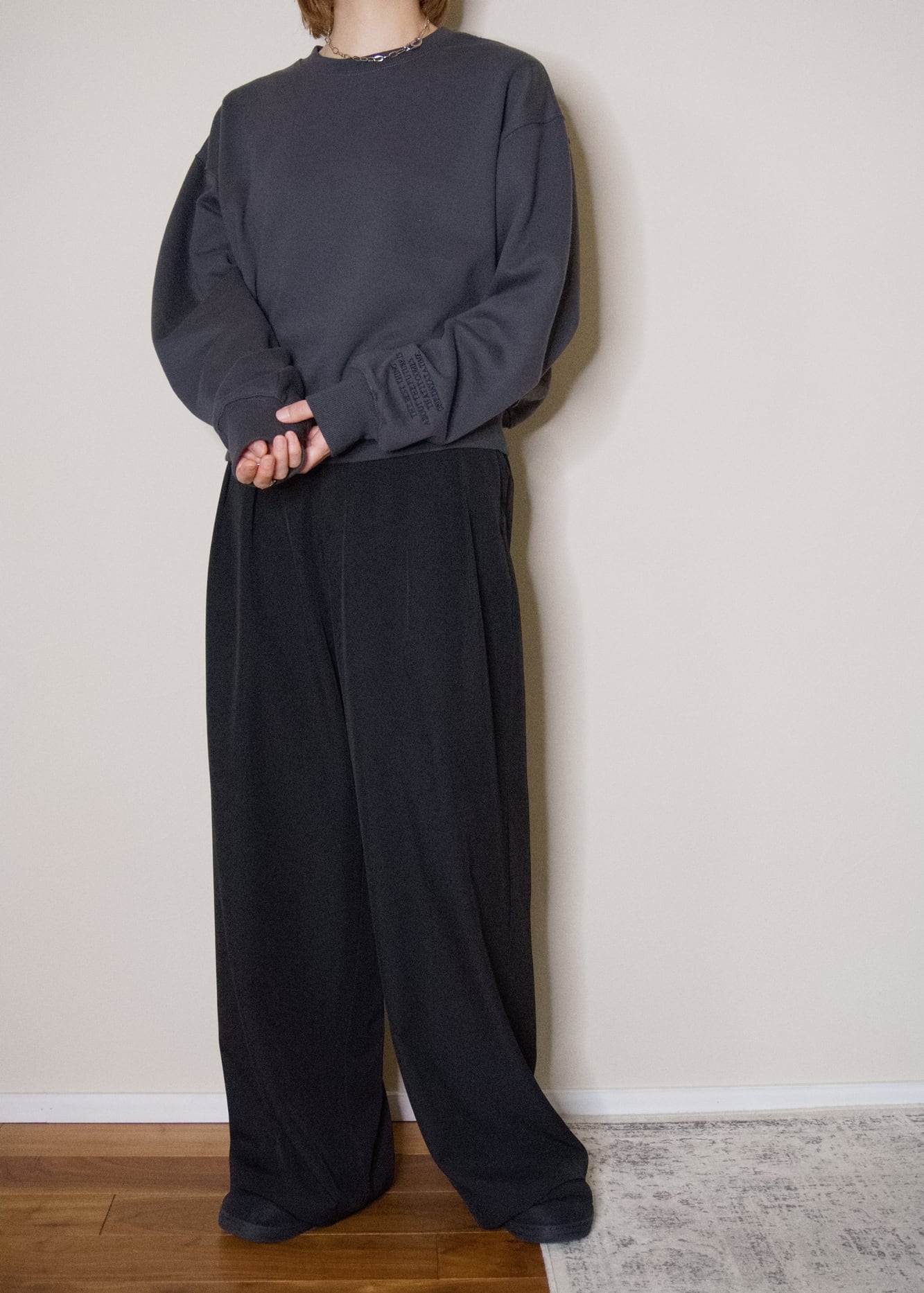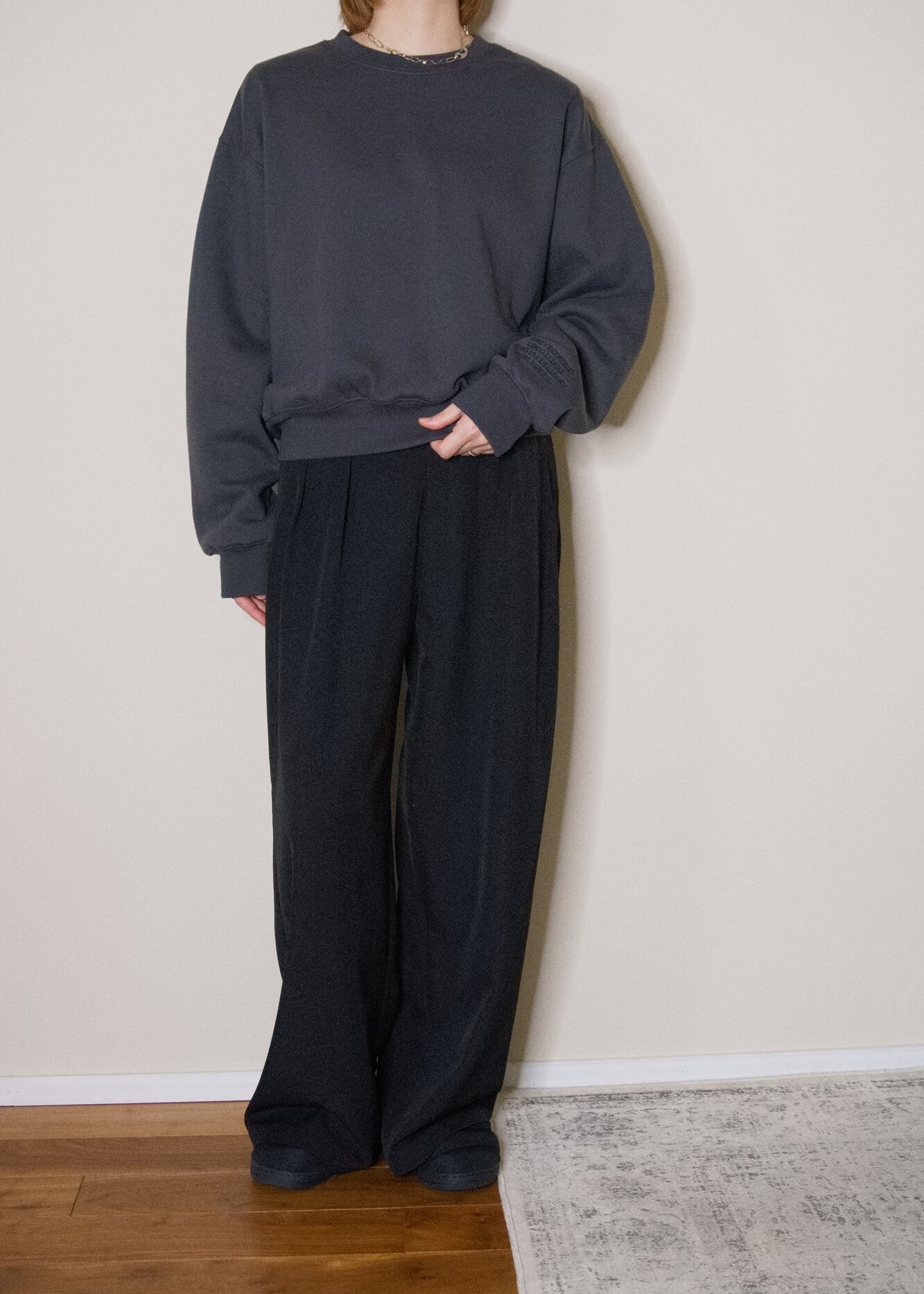 長めのクシュっとする袖と、自然にウエストで止まるすっきりとした着丈のバランスで、ゆったりなのに、ルーズにならないのが大人スエットのポイント