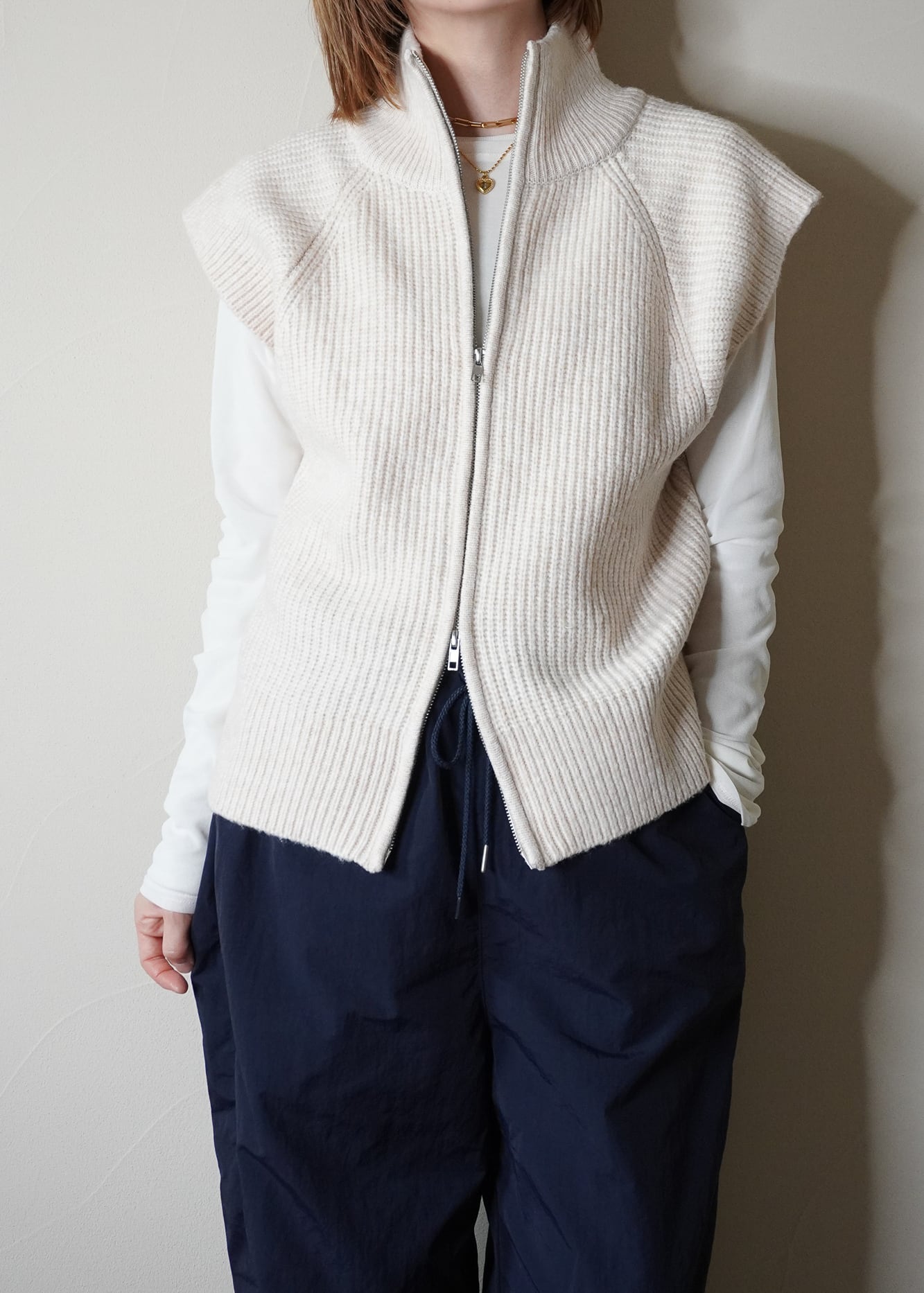 シンプルなカットソーにプラスするだけでお出かけスタイルが完成するニットベスト