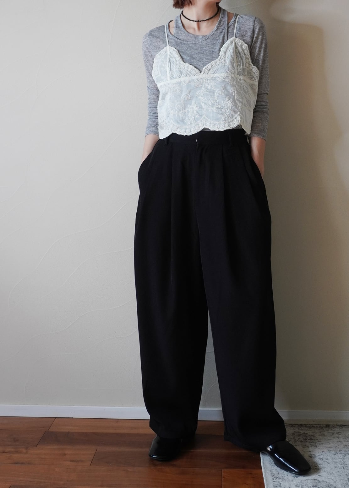 ハイウエスト仕様なので、高身長(画像モデル170cm)の方はウエストを落として、ゆるっとした雰囲気で!