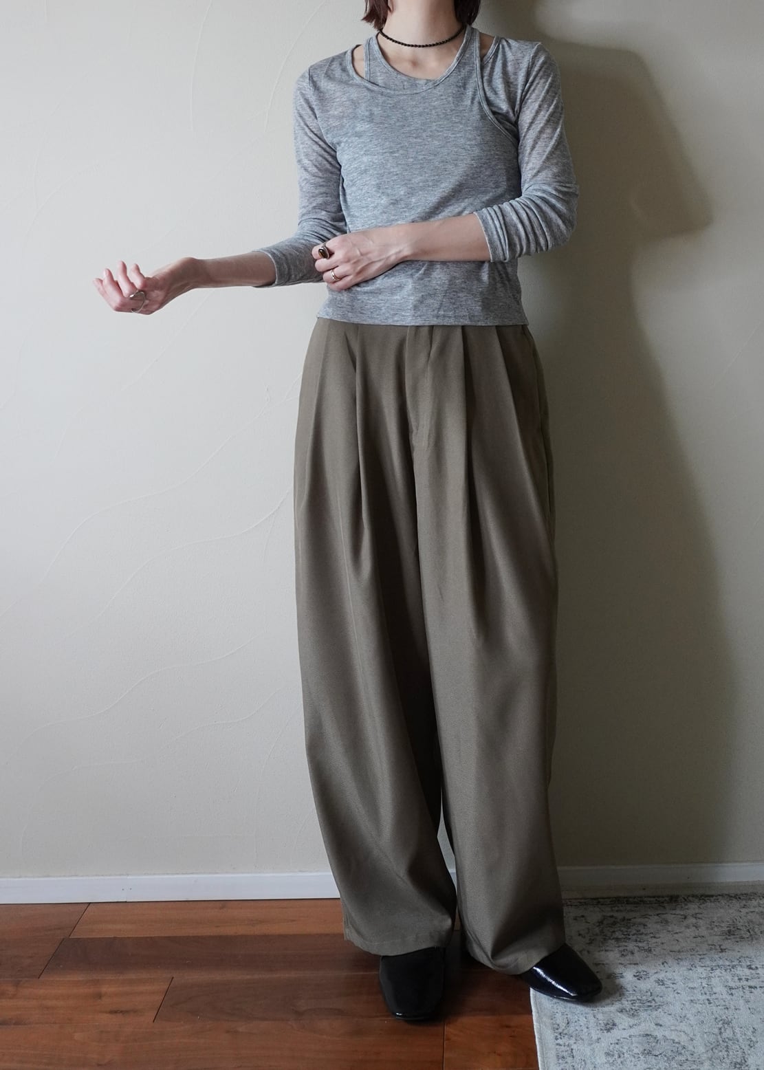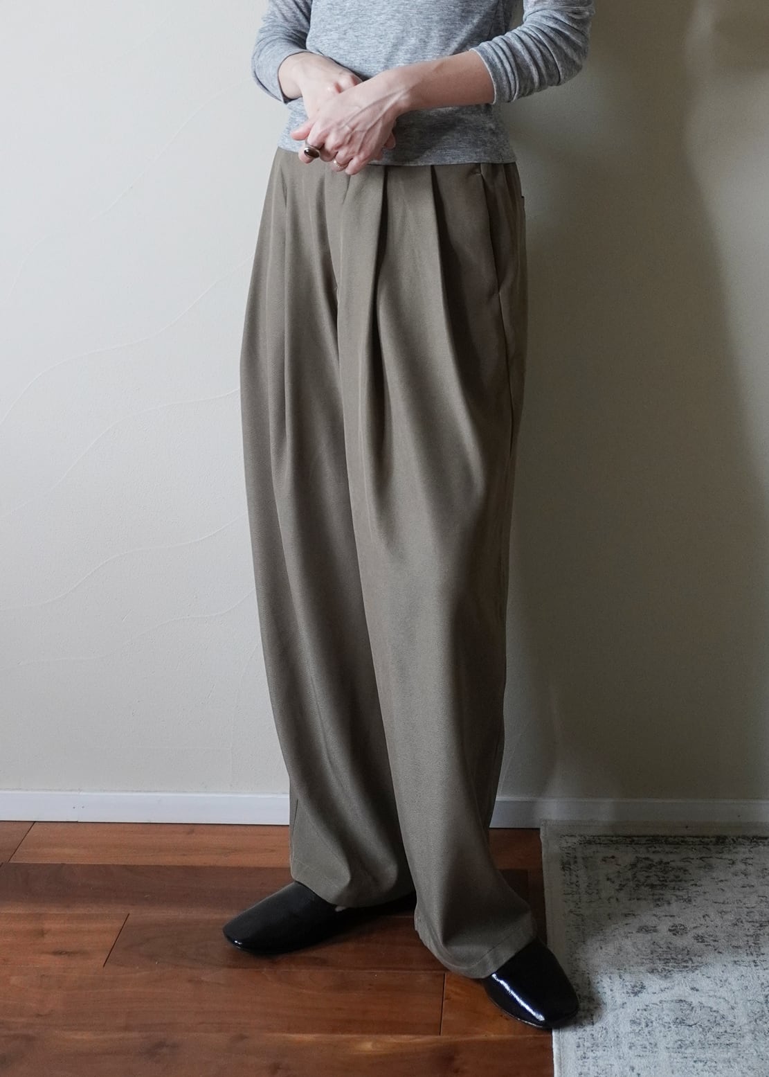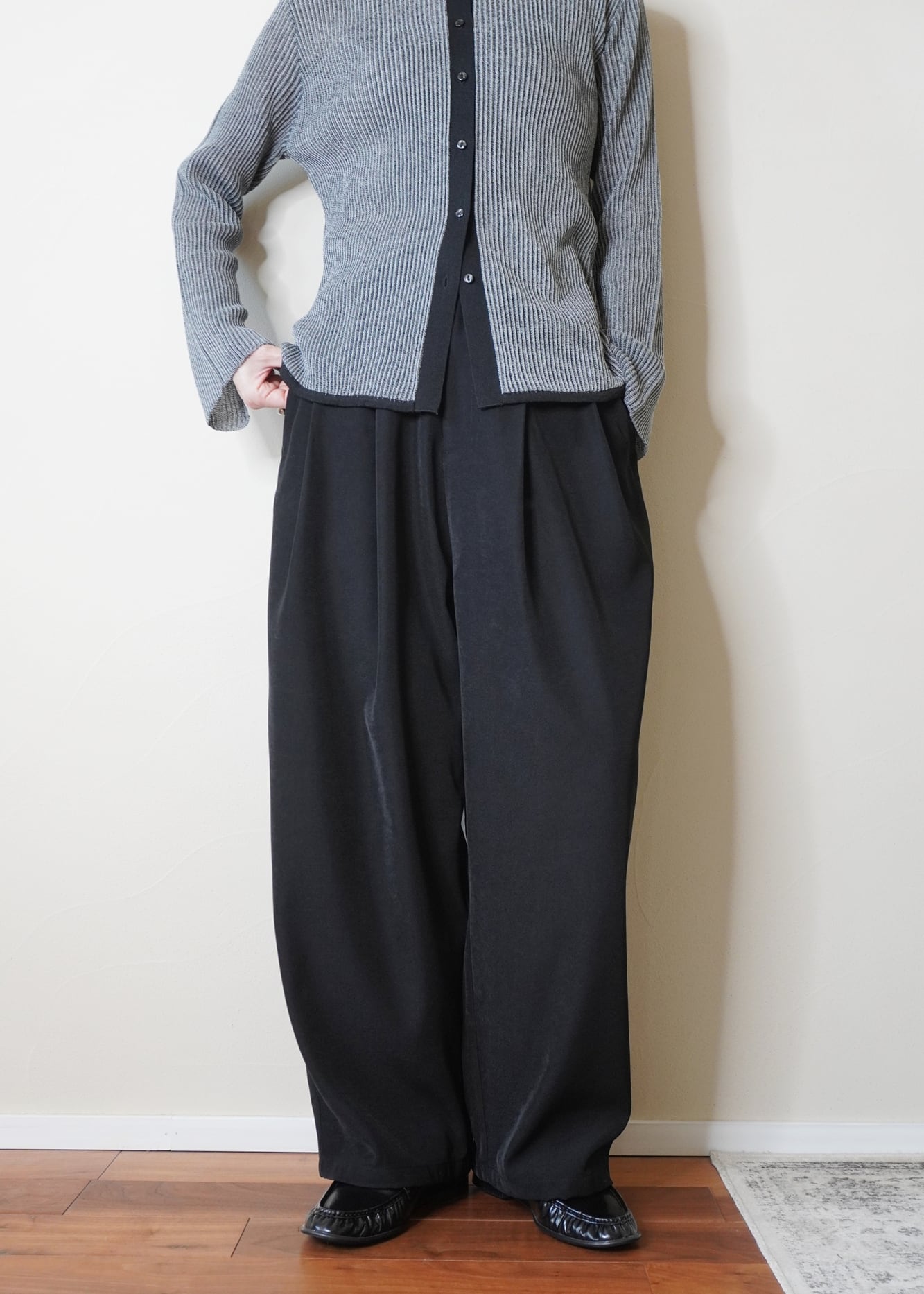 フロントに深めのタックを入れて、ヒップ周りにボリューム感をもたせて、立体的に仕上げた絶妙なシルエット