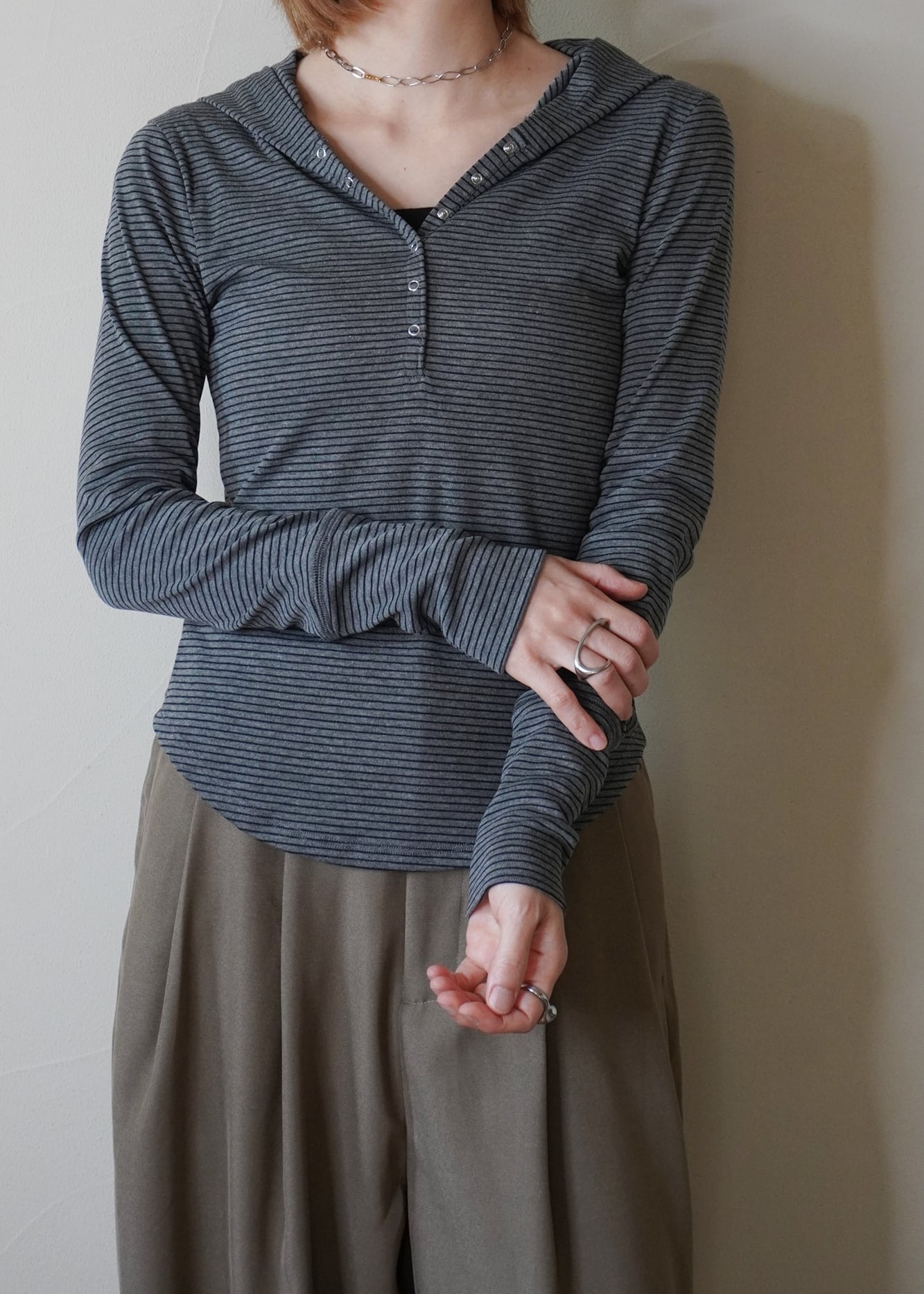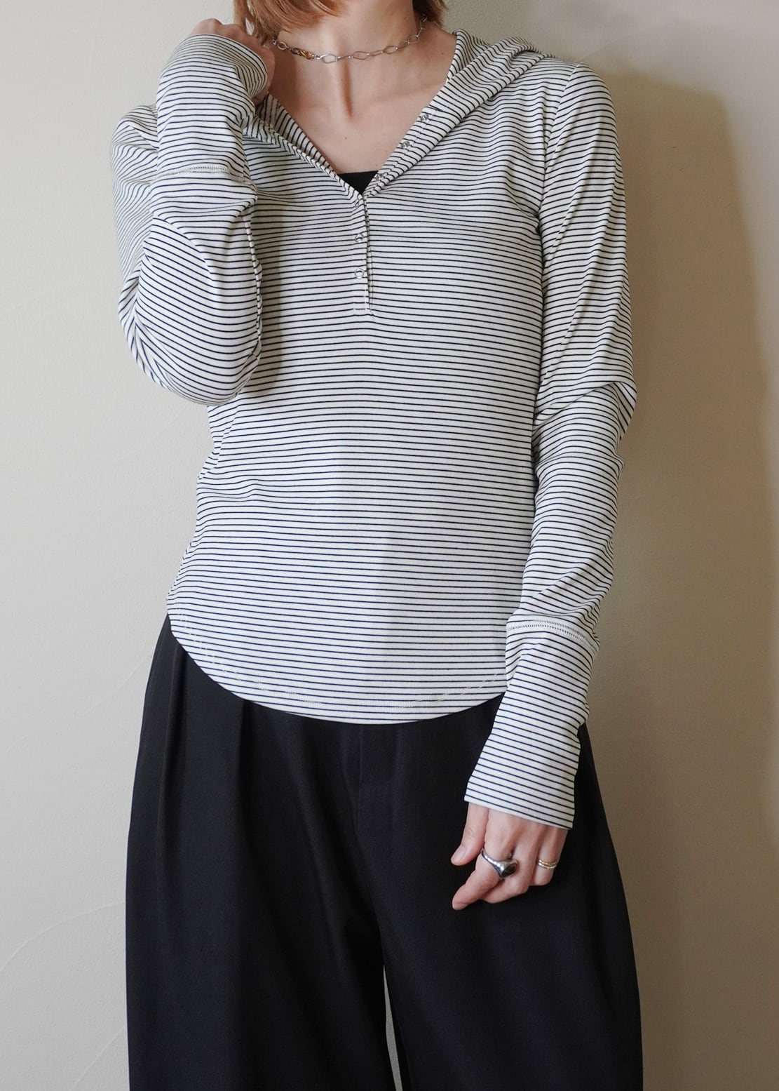 スエットとTシャツの中間のような、程よい質感で一枚でもインナーとしてもオールマイディーにご着用いただけるフーディートップス