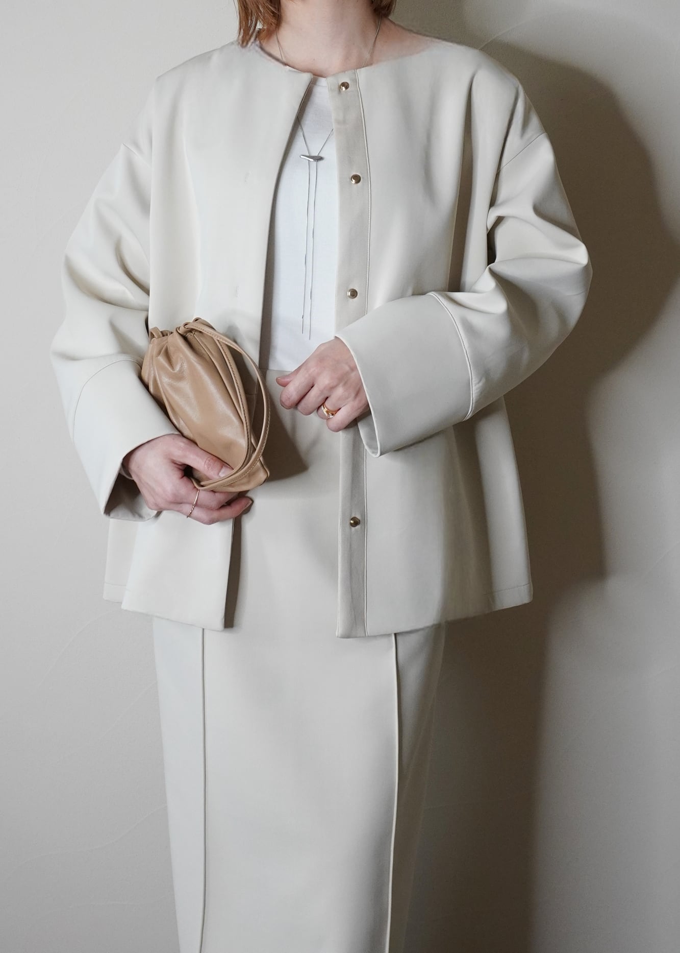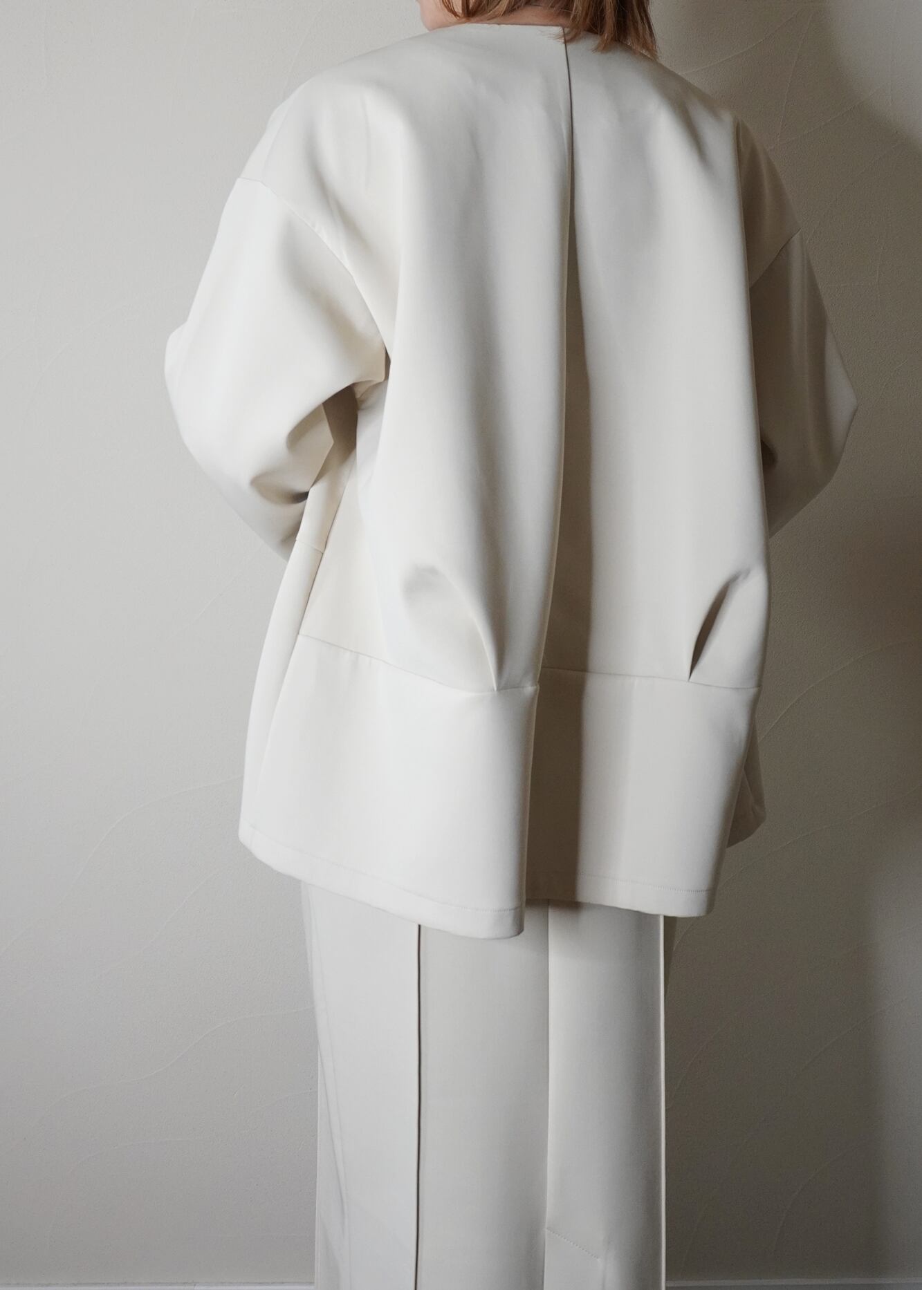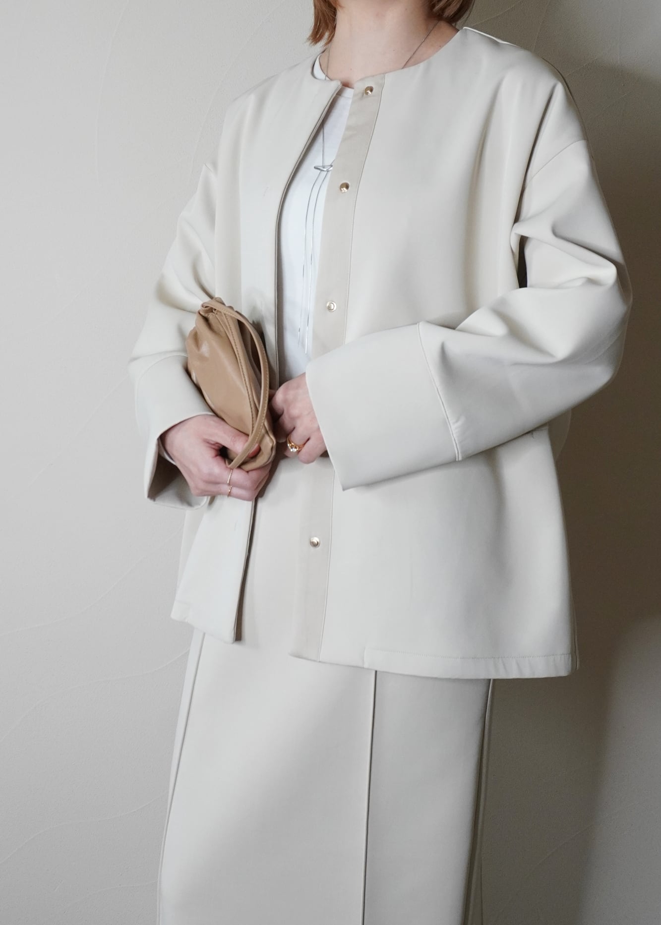 装飾を省いたノーカラーで、大人の女性の洗練された印象に仕上げました