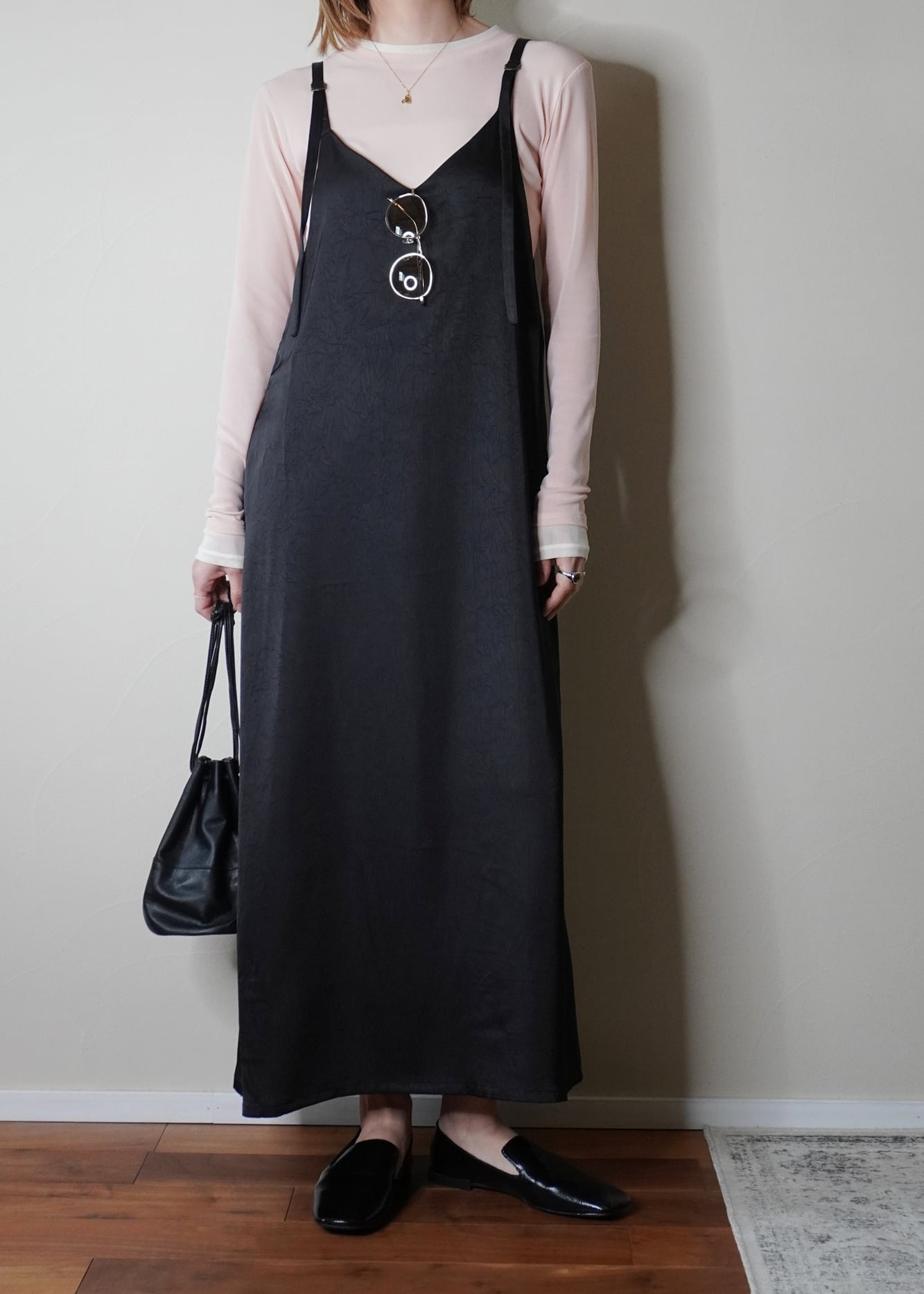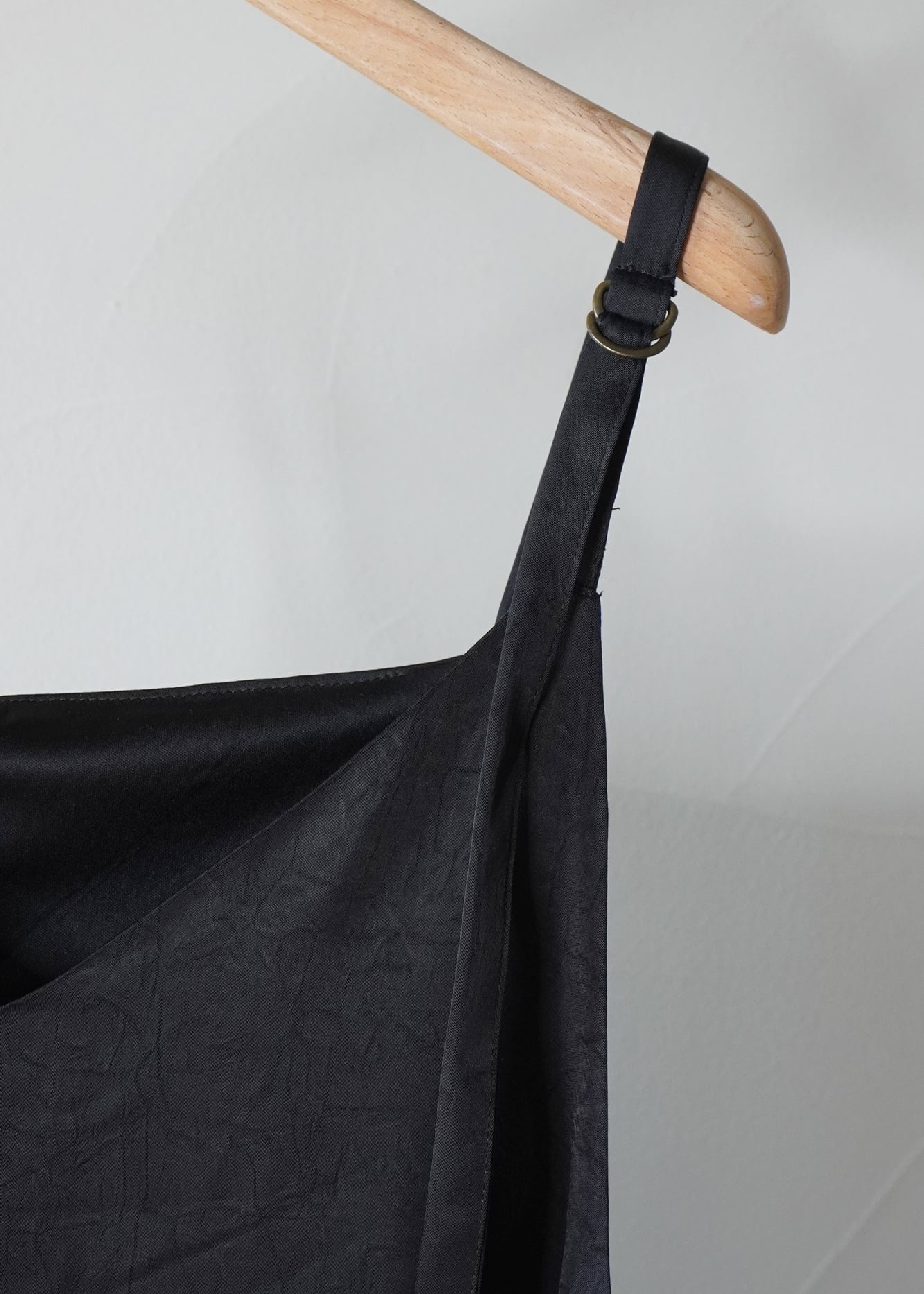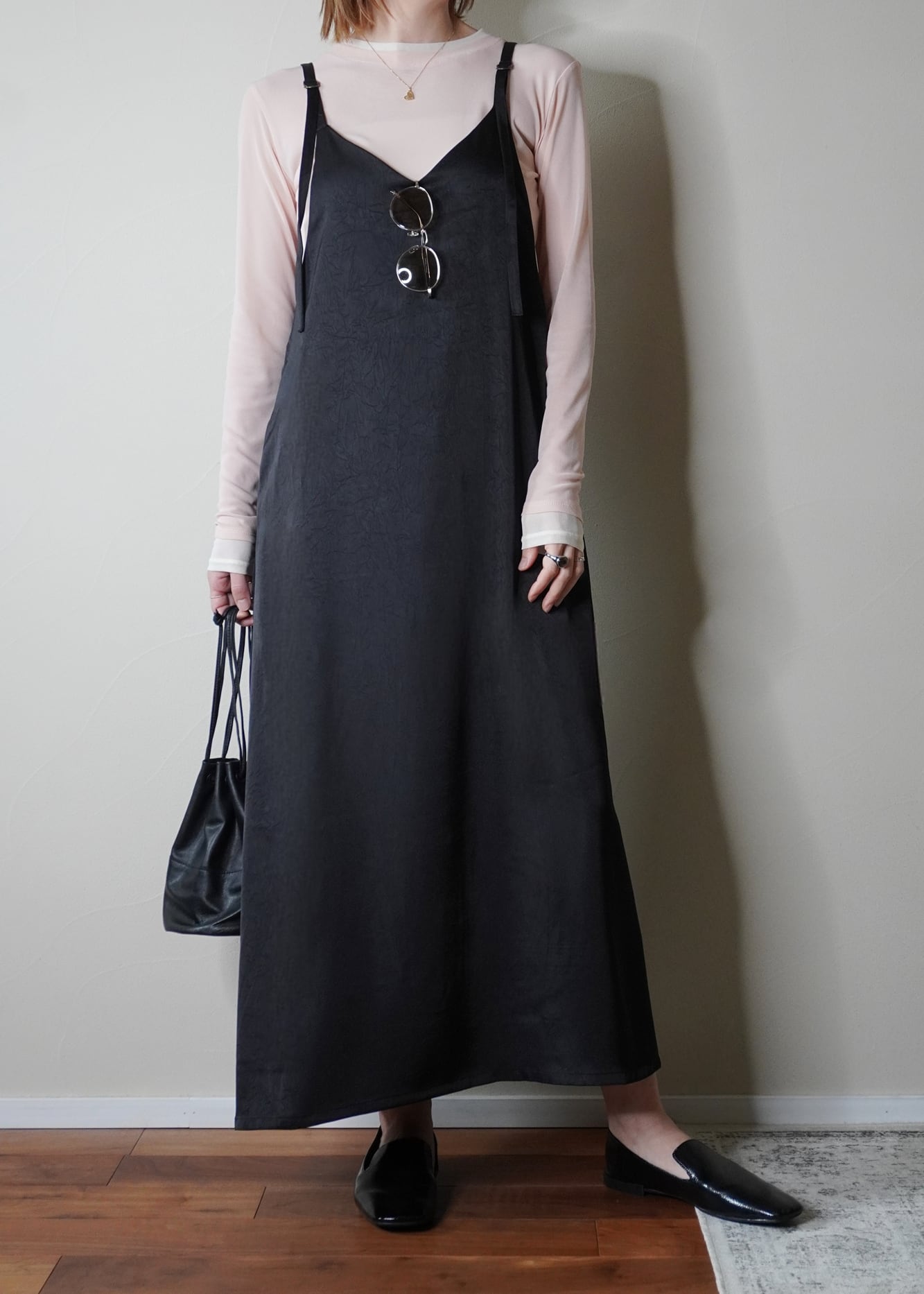 洗いをかけたポリエステルサテンを使用した、キャミソールワンピース。