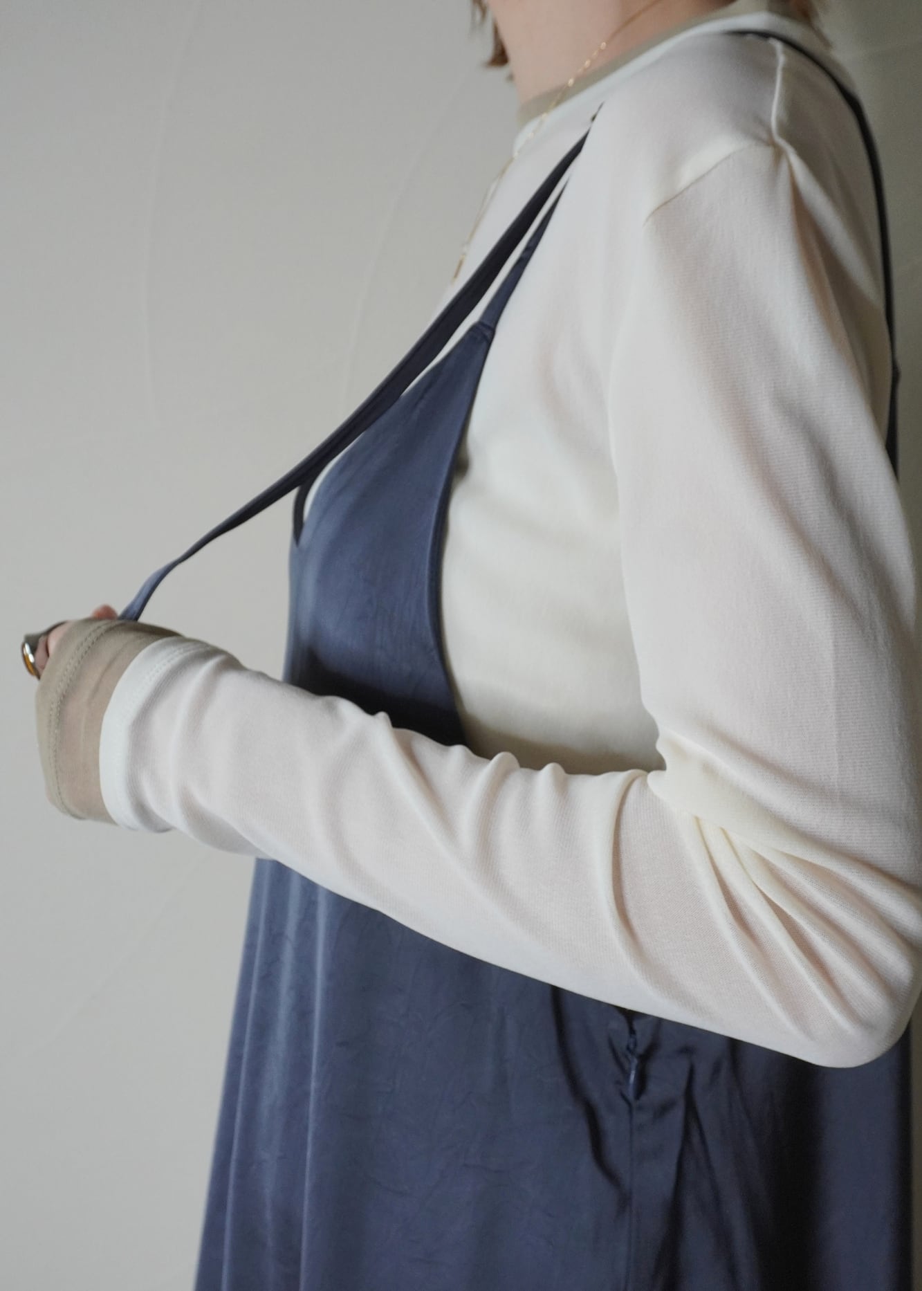 サテン特有の上品な光沢に、あえてナチュラルなシワ感を残すことで、気負わない表情に仕上げました。