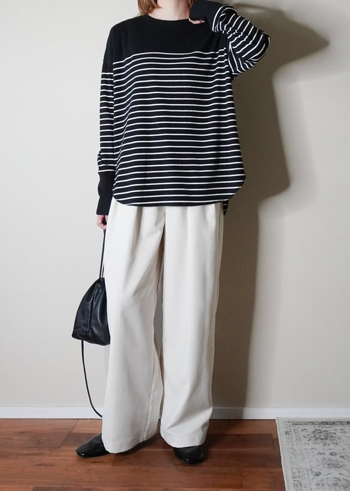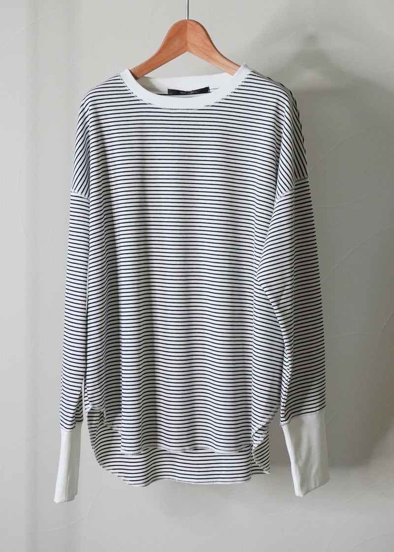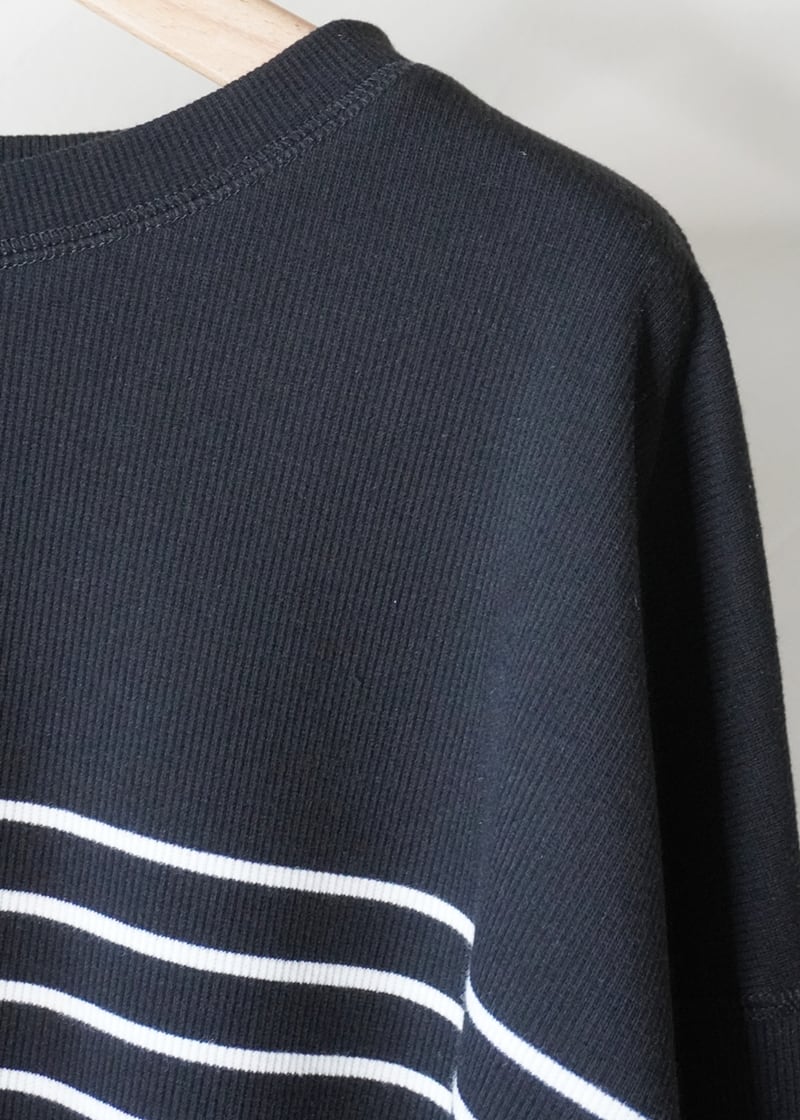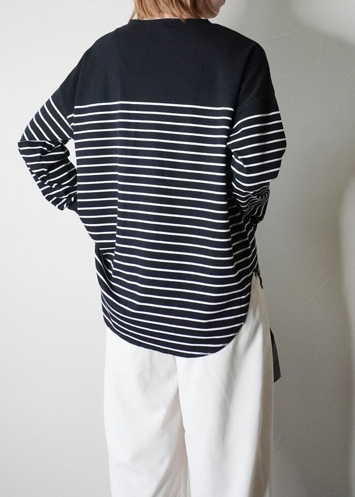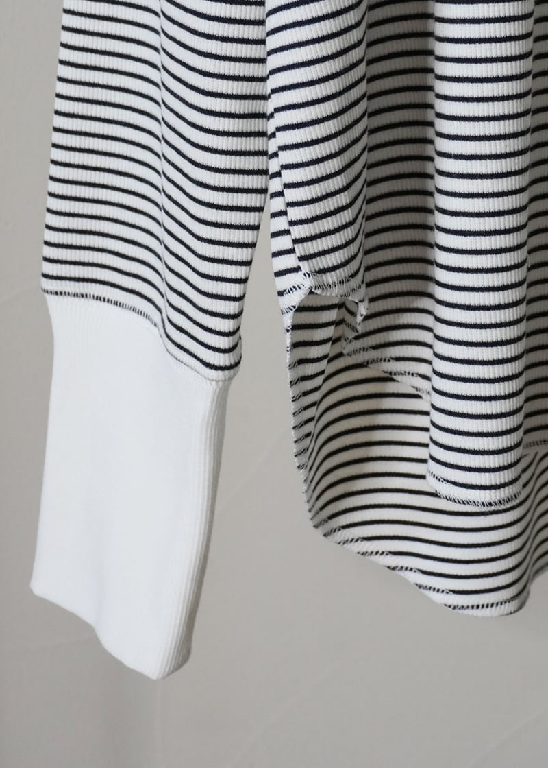定番の着回しに便利なホワイトベースと、ニュアンス感のあるオートミールにカーキを配した、コーディネートに取り入れやすい細めのボーダー柄でご用意しました。