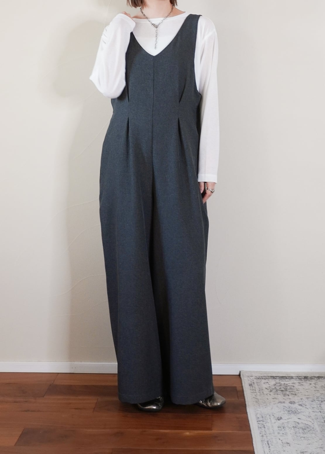 Vネックが縦のラインを強調し、インナー次第で表情を変えてくれる一着です