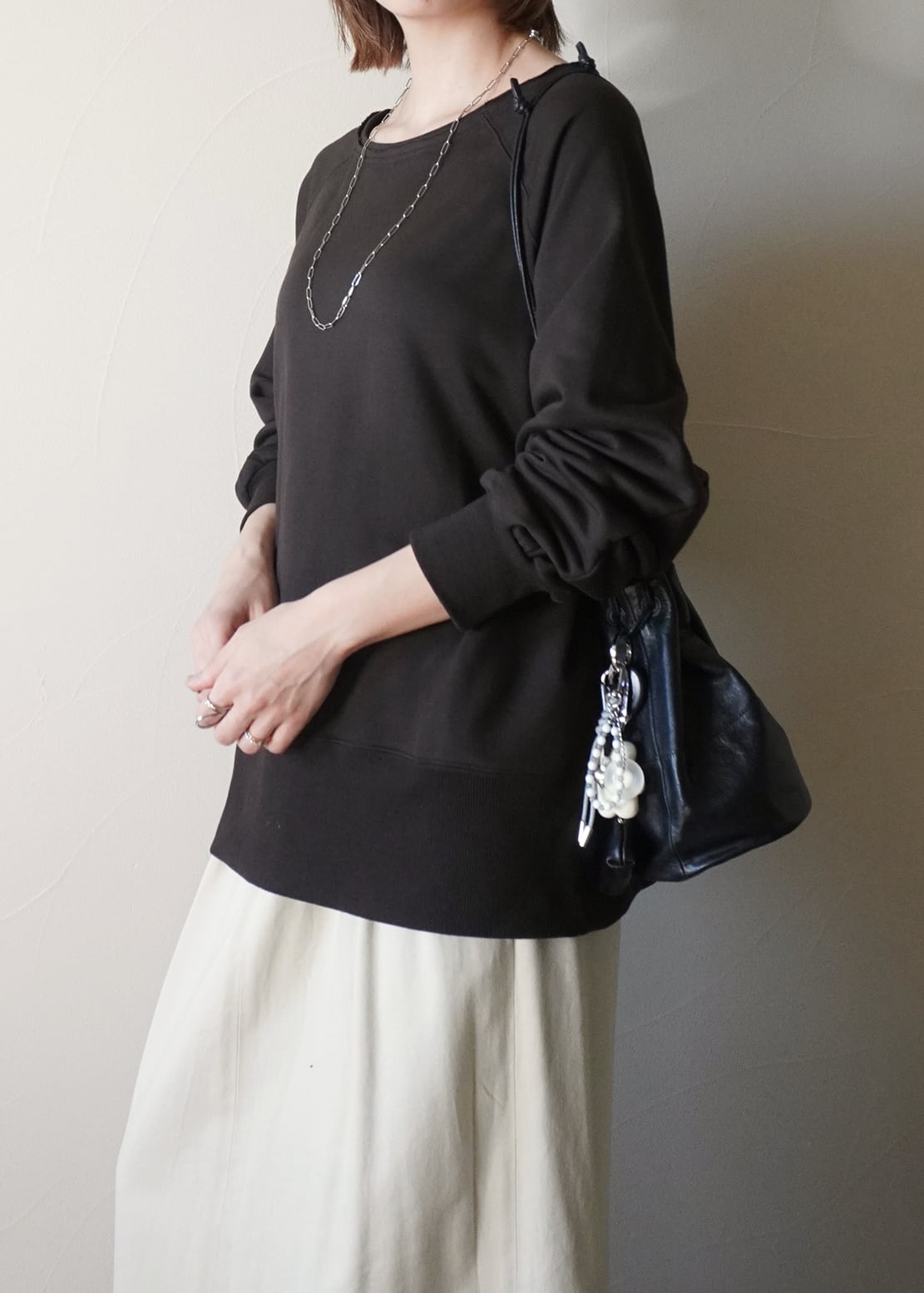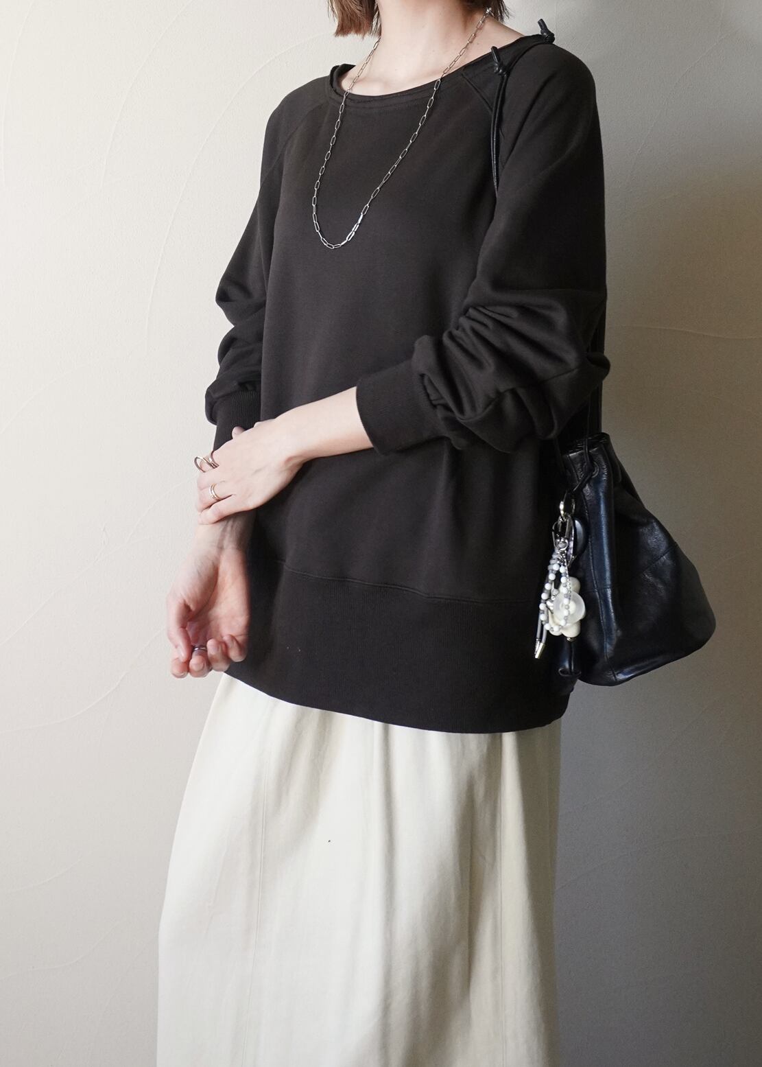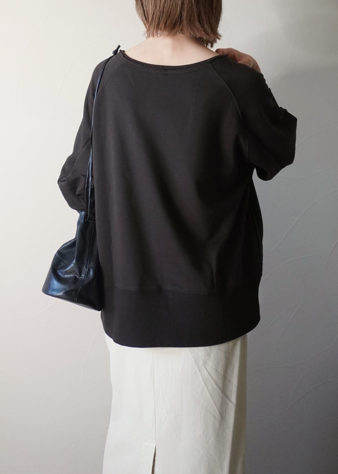 ゆったりとしたシルエットは、太目の裾のリブでメリハリをつけながら、お袖のシャーリングで立体的なシルエットを演出