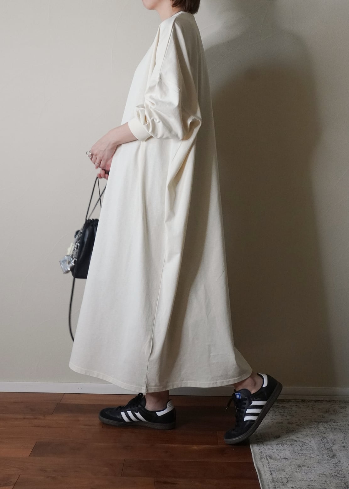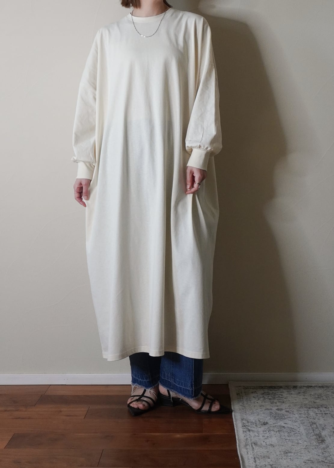 程よくハリのあるコットン素材で仕立てたミニマルなTシャツワンピース。