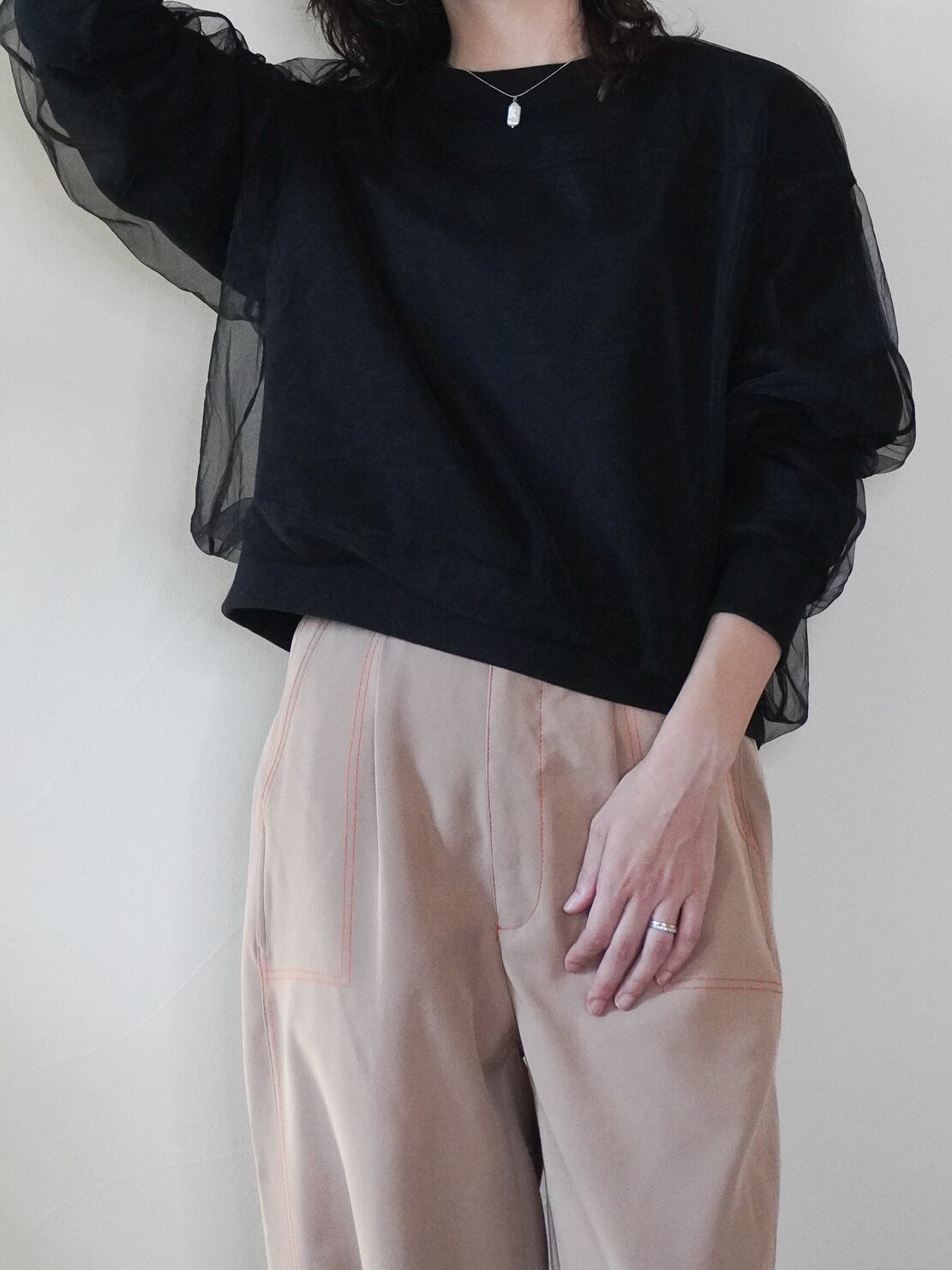 カジュアルなスエット素材にチュールを合わせた、女性らしい華やかな雰囲気のトップスです
