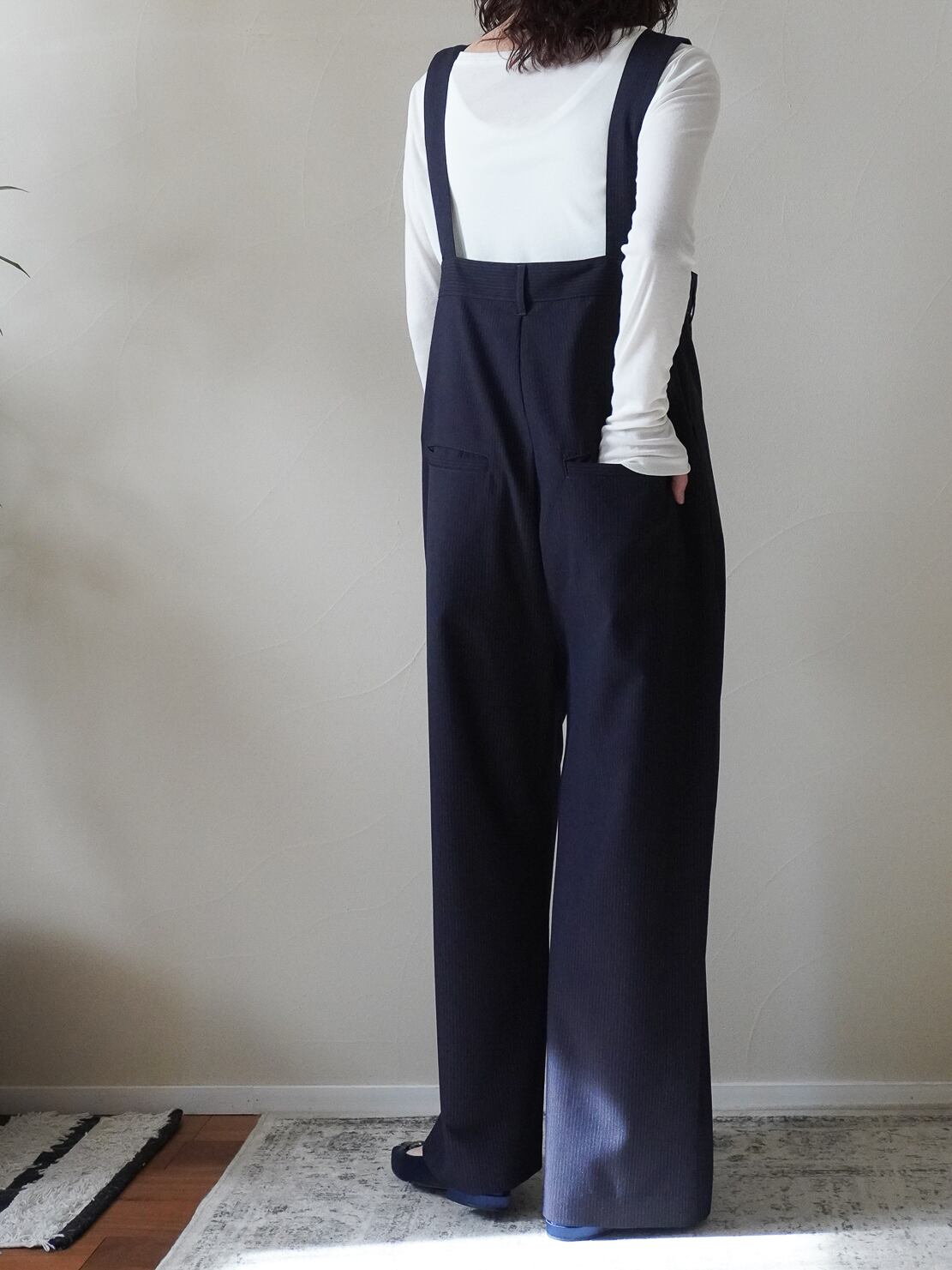 柔らかく、滑らかなドレープ感と上品なネイビーベースのピンストライプで、大人の女性にぴったりなオーバーオールに仕上がりました
