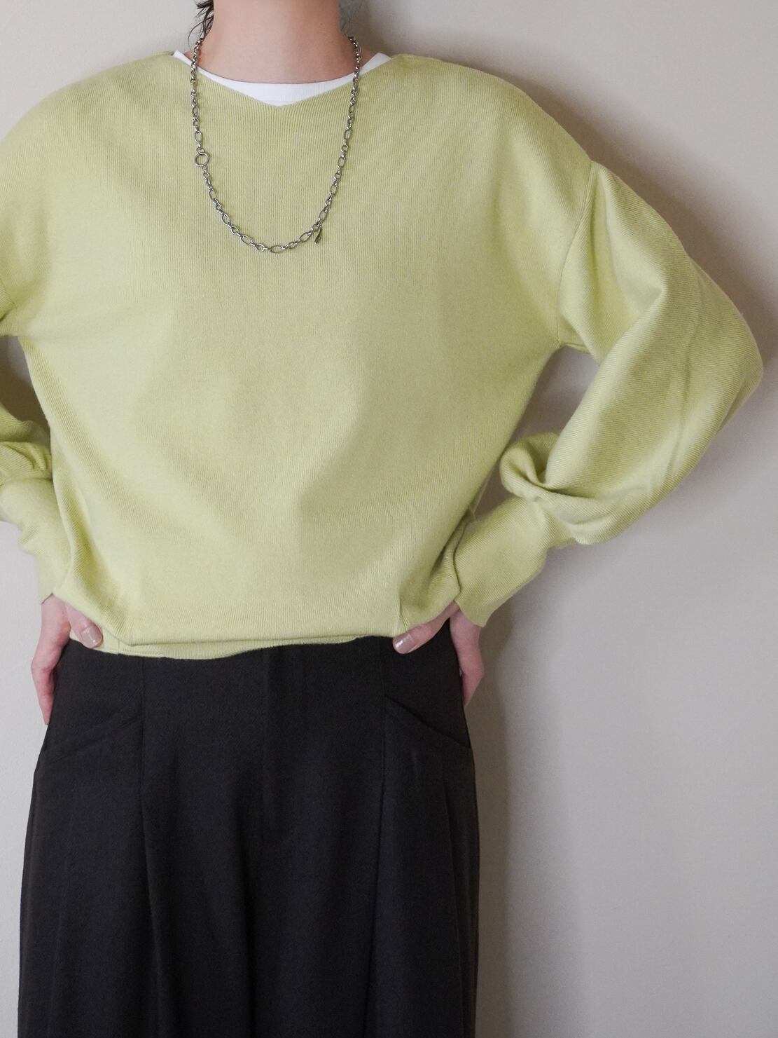 包み込むように柔らかく、肌に吸い付くようにもちっとした質感が心地よく、着ていて落ち着きや安らぎを感じさせてくれるようなプルオーバーニットです