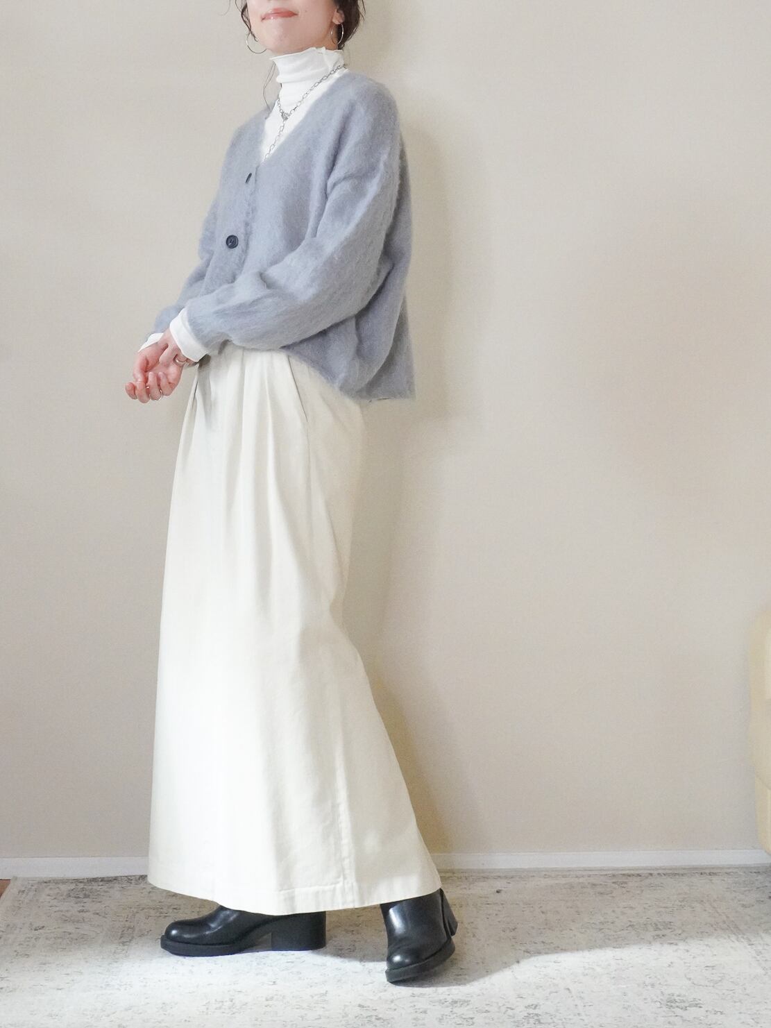 薄手のタートルを合わせた、季節感のある軽い着こなしもおすすめです