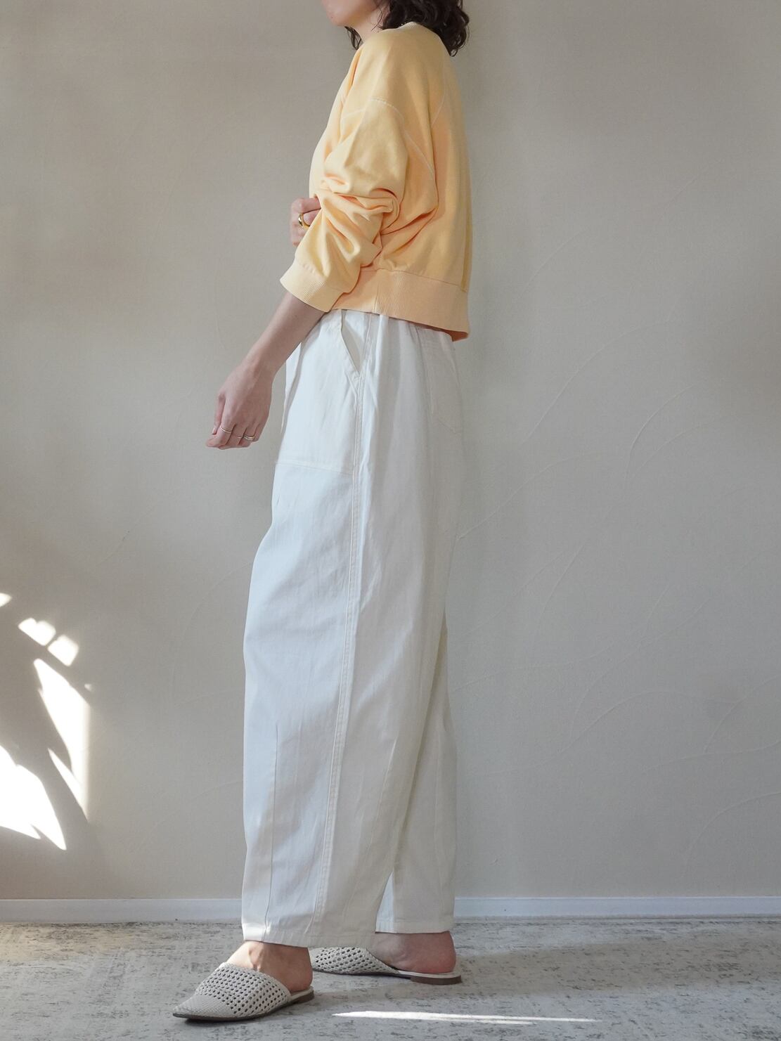 ゆったりとした身幅をややショート丈にすることで、女性らしい軽やかな仕上がりに加え、袖丈をゆるく長めにすることで、今の気分にぴったりな緩さをプラスしています
