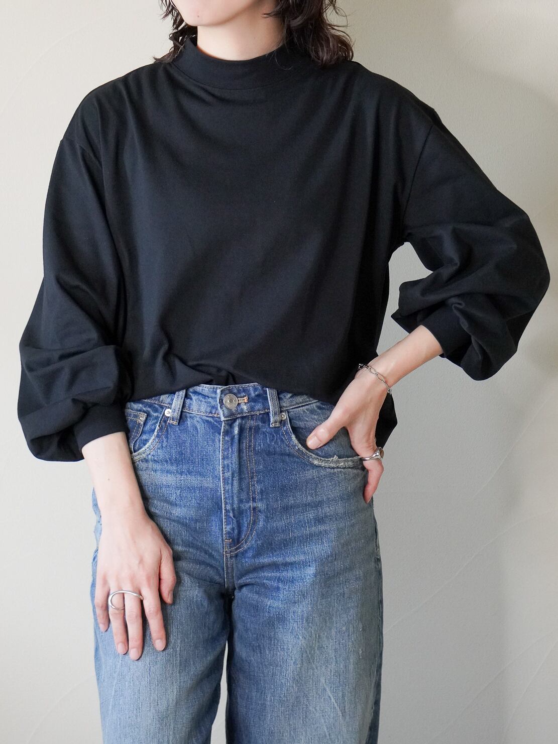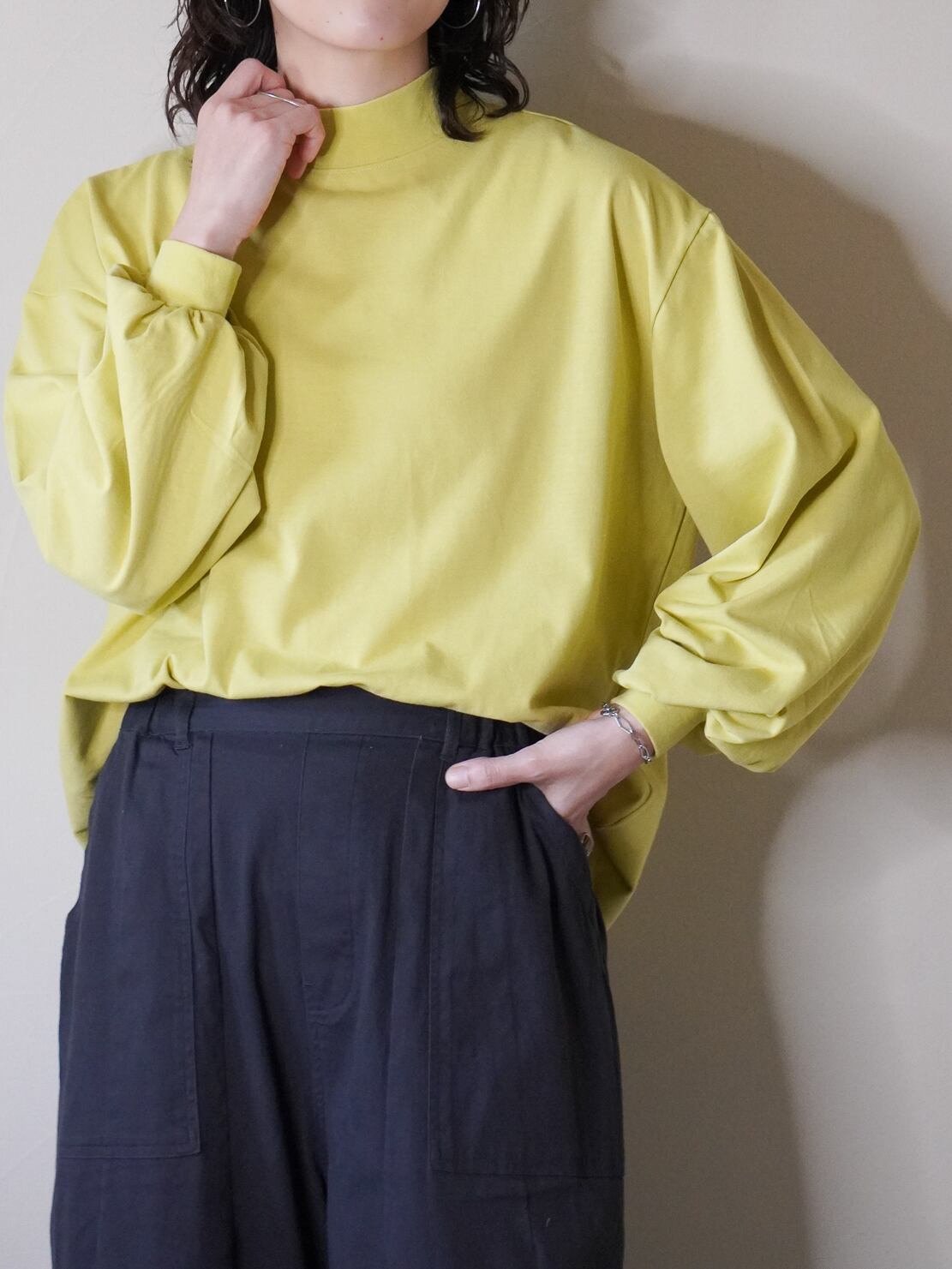 ハイネックとボリュームのあるお袖がシンプルになりすぎず、シンプルに合わせるだけでもオシャレ見えしちゃいます♪
